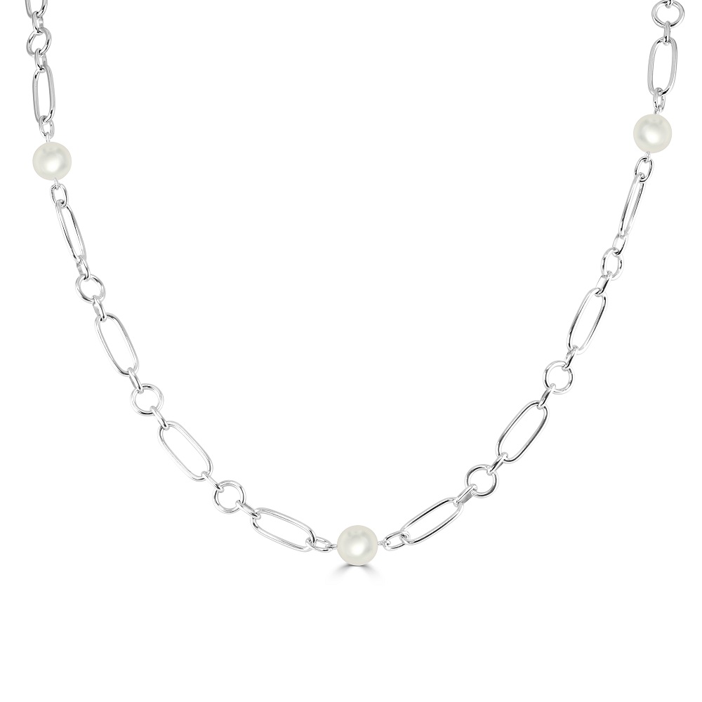 A contemporary 18ct white gold necklace from the Mikimoto M Code collection. This exquisite piece features six evenly spaced Akoya cultured pearls, renowned for their lustrous sheen and perfect round shape, symbolizing the pinnacle of sophistication and grace. The design intricately alternates between large oval links and smaller round links, creating a stunning visual rhythm and enhancing the necklace's contemporary appeal. Ideal for those who appreciate modern design without compromising on timeless elegance, this necklace is perfect for adding a touch of sophistication to any ensemble.