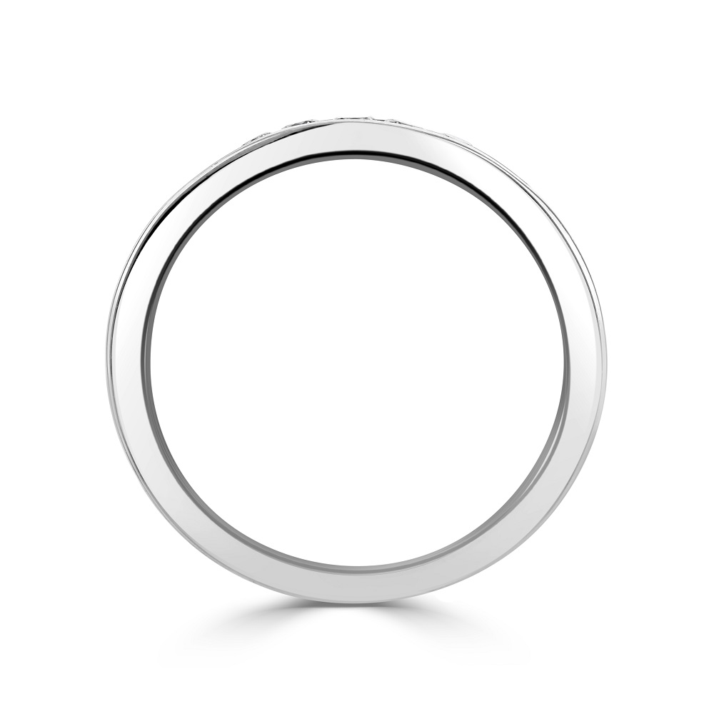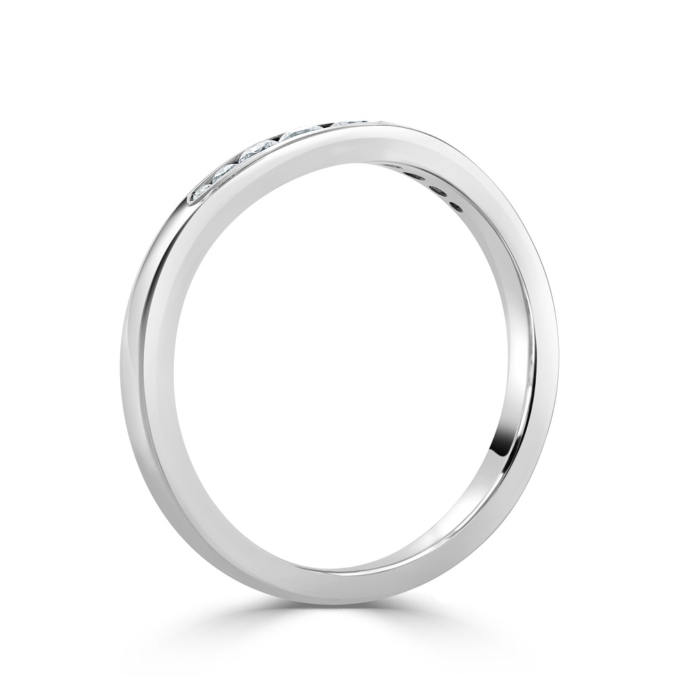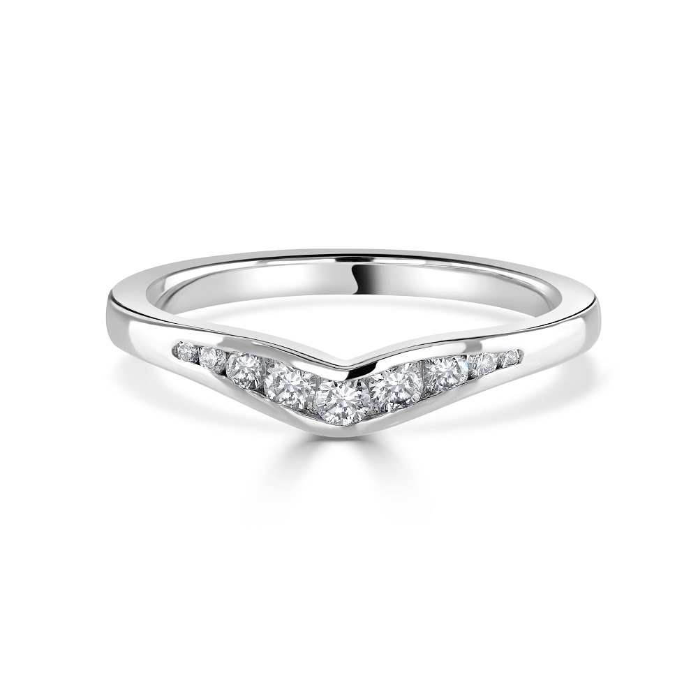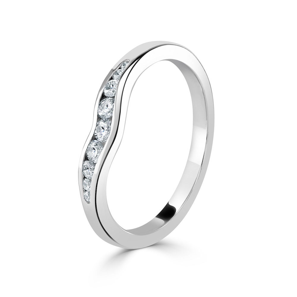 Elevate your special day with our exquisite 18ct white gold shaped wedding ring, meticulously designed to celebrate lasting love. This elegant ring features a unique contoured shape, seamlessly fitting alongside an engagement ring or worn alone for a stand-alone statement. It is adorned with nine channel-set, graduated round brilliant cut diamonds, totalling 0.22ct. The diamonds are skilfully arranged to enhance the ring's curvature, providing a continuous sparkle that captures the eye. Crafted from luxurious 18ct white gold, this wedding ring boasts a sleek finish that complements its refined design, making it an ideal choice for those who value elegance and timeless beauty in their bridal jewellery.