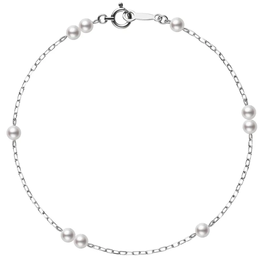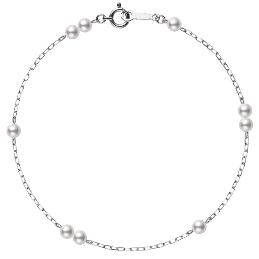 A timeless addition to your jewellery collection this pretty pearl and chain bracelet can be worn by itself or layered with other bracelets. Featuring nine Akoya cultured pearls (3.50-3.75mm) set in 18K white gold chain. Bracelet length is approx 7” long.