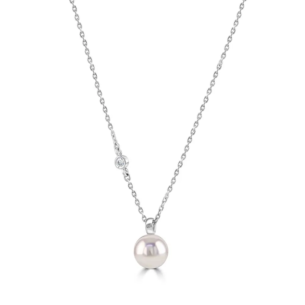 This classic pendant, adorned with Akoya cultured pearl, is perfect to treat yourself and give it as a gift. The sparkle of the diamond adds a touch of glamour.This pendant features a 7.00mm Akoya cultured pearl with 0.02ct of diamonds set in 18ct white gold. The chain length is adjustable, from 16" to 18".