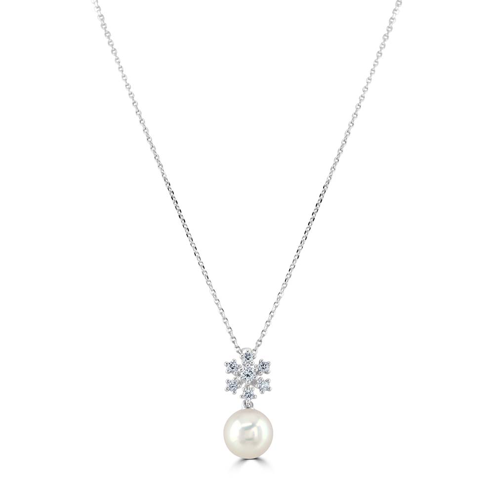 This exquisite 18ct white gold Mikimoto pendant showcases a captivating design inspired by the serene beauty of winter. It features seven round brilliant cut diamonds; each meticulously claw set to form a delicate snowflake pattern. These diamonds glisten with a brilliant sparkle, reminiscent of freshly fallen snow under the winter sun. Dangling gracefully below the snowflake is a single Akoya cultured pearl, renowned for its perfect round shape and luminous sheen, adding a touch of timeless elegance. This pendant is suspended from an 18ct white gold 18 inch trace chain, which is thoughtfully designed to be adjustable to 16 inches, providing versatility to suit various necklines and styles.