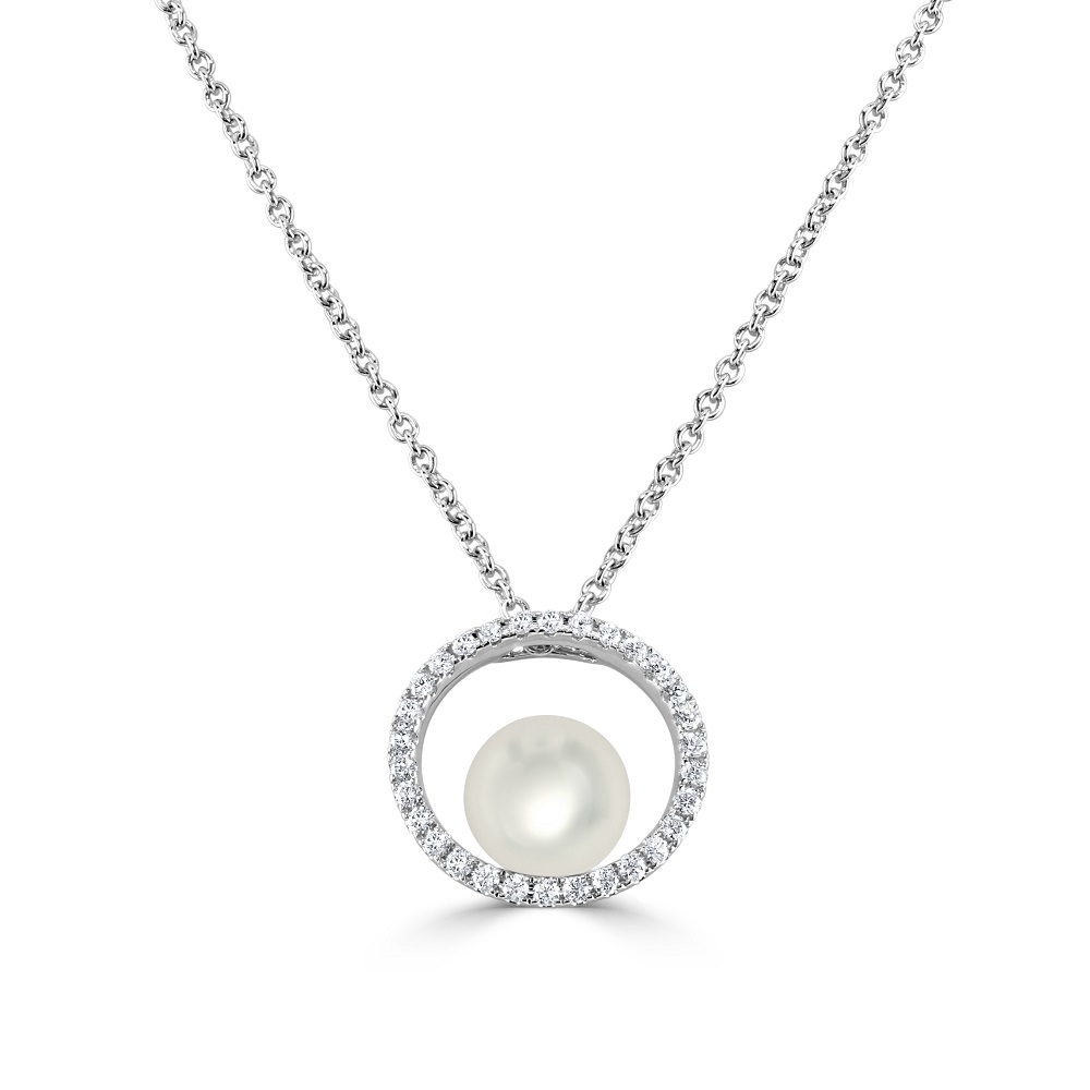 18ct White Gold Akoya Cultured Pearl and Diamond Circle Pendant
