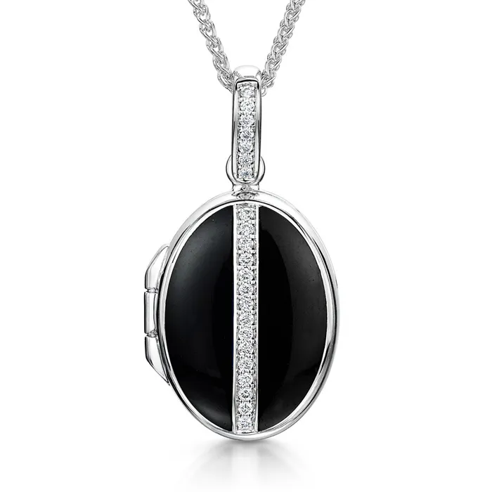 Introducing our exquisite 18ct white gold oval locket, a masterpiece of elegance and intricate design. This stunning locket features a sleek surface of vitreous black enamel, beautifully complemented by a line of pavé-set diamonds that add a touch of sparkle and luxury. The locket is further enhanced with a pavé-set diamond bale, making it a true statement piece. With a total diamond weight of 0.11 carats, this locket combines timeless charm with contemporary sophistication. Suspended on an adjustable chain, it offers versatility and comfort, allowing you to choose the perfect length for any neckline or occasion. Ideal for keeping cherished memories close to your heart, this locket is perfect for gifting or as a special addition to your jewellery collection.