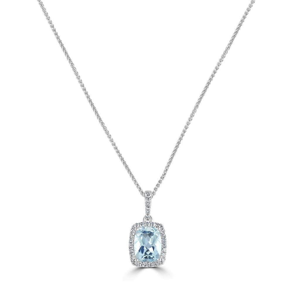 Radiating elegance and sophistication, this stunning 18ct white gold pendant features a captivating cushion cut aquamarine, claw set at the centre to showcase its serene blue hue and exceptional clarity. Surrounding the aquamarine is a shimmering halo of round brilliant cut diamonds, adding brilliance and contrast to the design. A diamond-set bale adds an extra touch of luxury, while the pendant is suspended from an 18ct white gold spiga chain, adjustable from 18 to 17 and 16 inches, offering versatile styling options for layering or solo wear. With a total aquamarine weight of 2.06cts and diamond weight of 0.26cts, this piece is a perfect blend of colour, sparkle, and craftsmanship — ideal for both everyday elegance and special occasions.