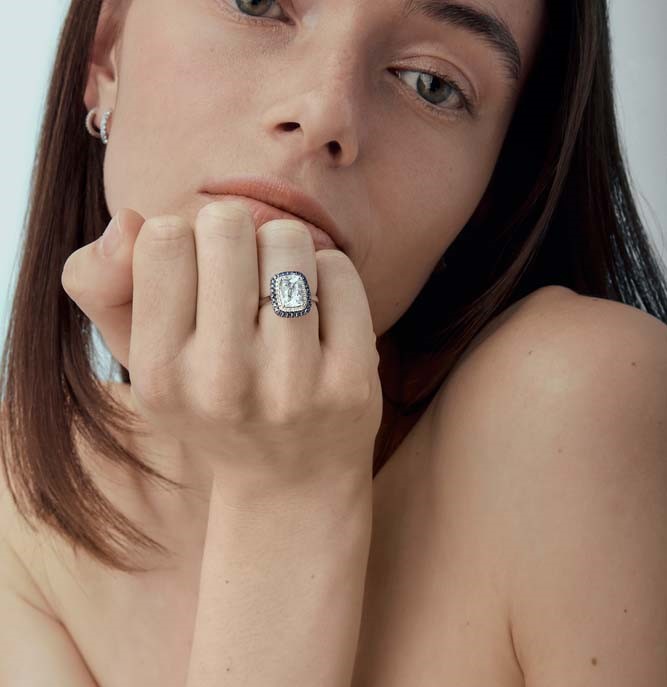 An exquisite 18ct white gold halo ring, a masterpiece of craftsmanship and design. At the heart of this luxurious ring sits a beautifully long cushion cut aquamarine, securely held by four claws and weighing an impressive 1.92 carats. The aquamarine's serene blue hue evokes the calmness of the sea and is perfectly complemented by the surrounding gems. Encircling the central aquamarine is a double halo setting: the first consists of 26 round brilliant cut diamonds totalling 0.15 carats, adding a radiant sparkle that enhances the aquamarine's luminous qualities. Following this shimmering circle is another halo of 28 round sapphires, contributing an additional layer of depth and colour with a total weight of 0.36 carats. This ring is perfect for those who appreciate the blend of timeless elegance and contemporary design. Whether it's for an engagement, anniversary, or as a luxurious gift, this ring promises to be a showstopper in any jewellery collection. The use of white gold complements the cool tones of the aquamarine and sapphires, ensuring that this piece remains a cherished accessory for generations.