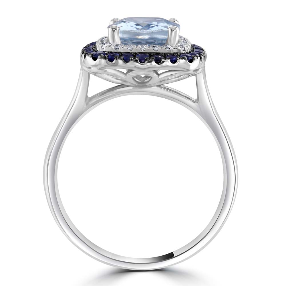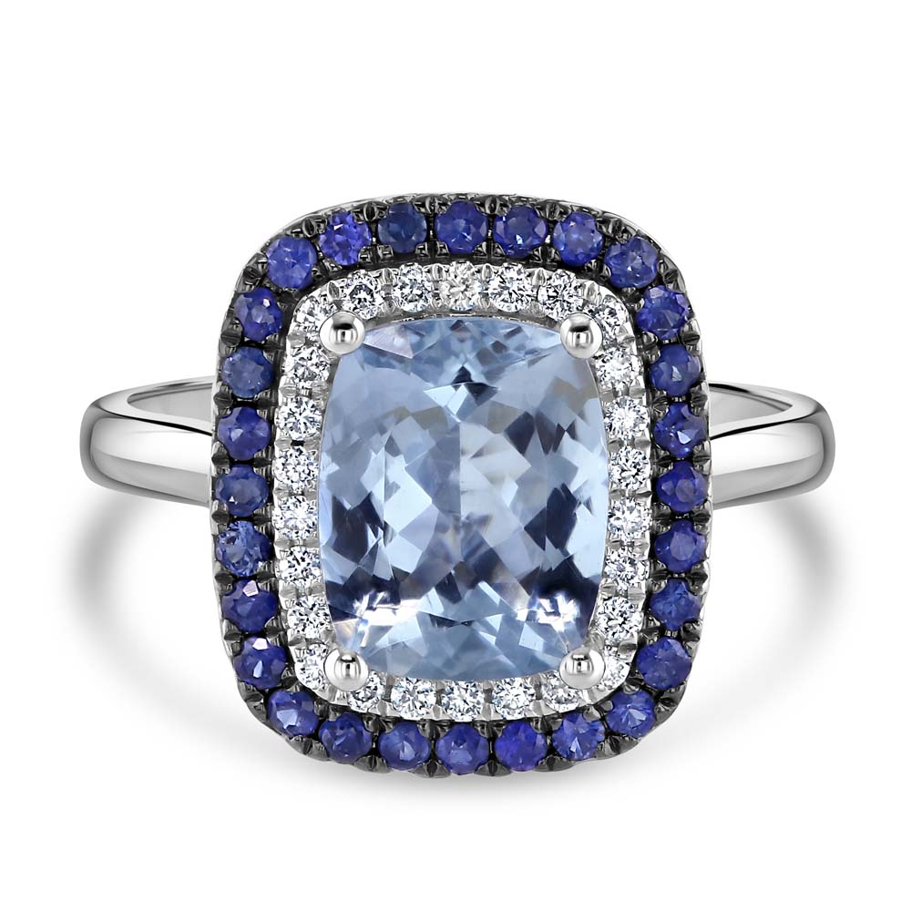 18ct White Gold Aquamarine, Sapphire and Diamond Halo Ring