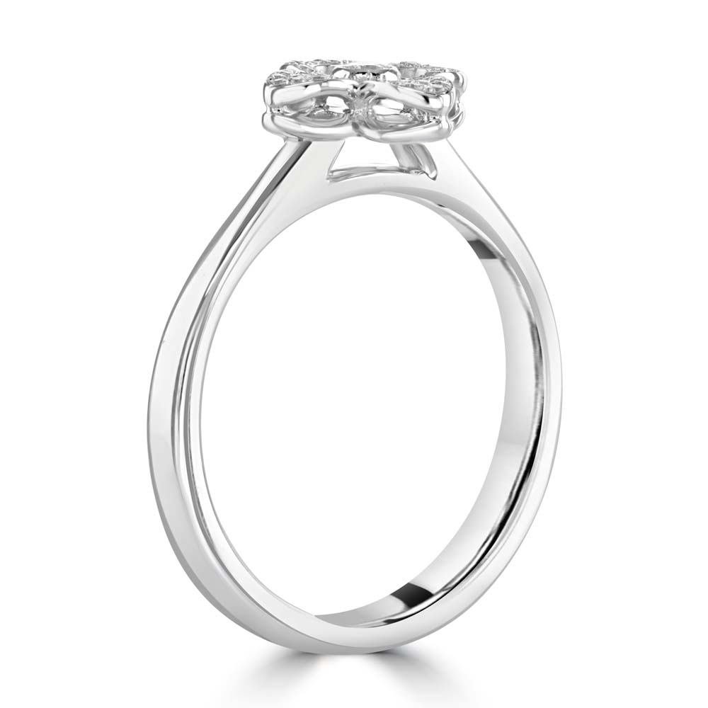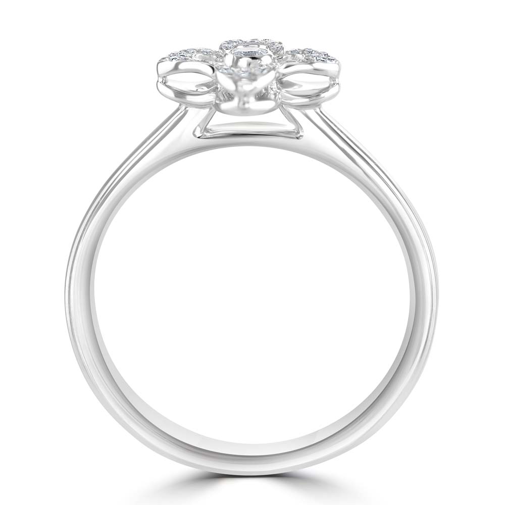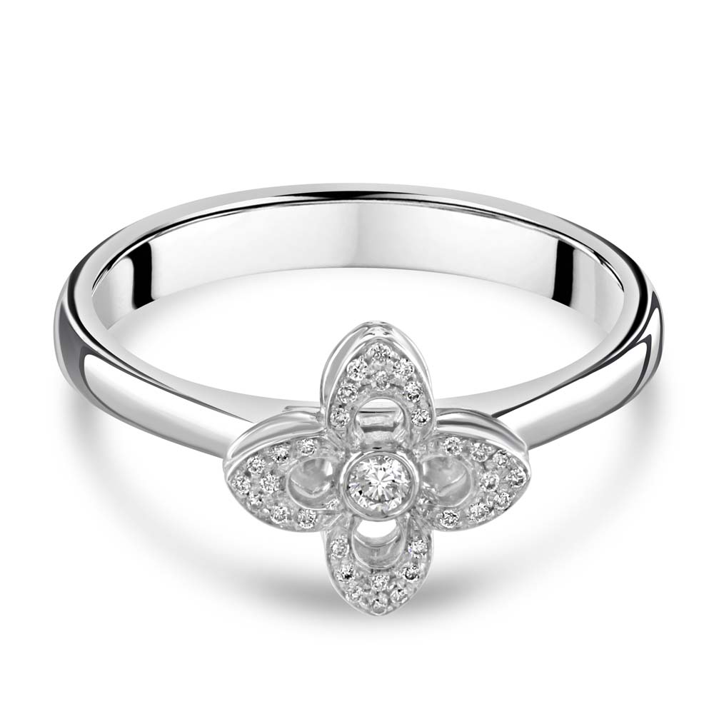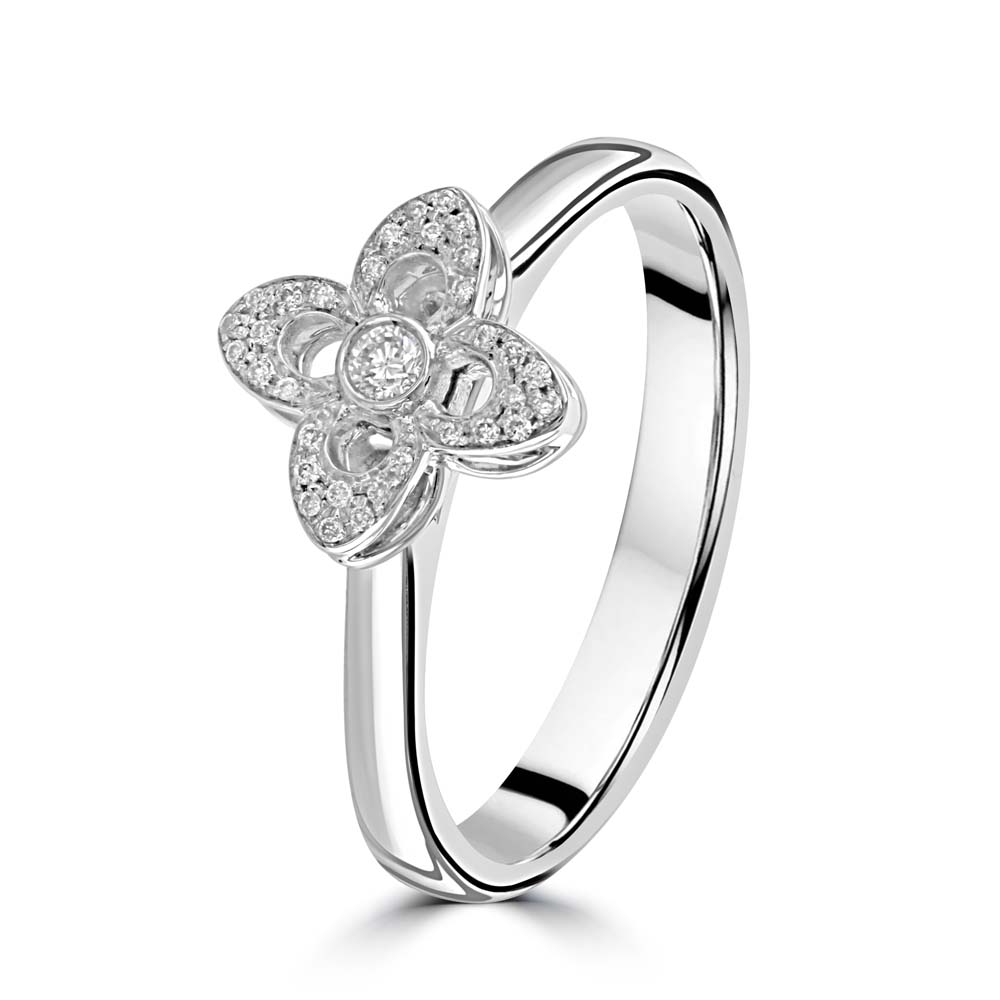 Indulge in the exquisite beauty of our 18ct white gold open flower style cluster ring. This stunning piece features a central rubover set round brilliant cut diamond, surrounded by 32 smaller round brilliant cut diamonds, grain set to form four delicate petals. Perfect for adding a touch of elegance and sparkle to any occasion, this white gold flower cluster ring is a true statement piece. Enhance your jewellery collection with this timeless and sophisticated diamond ring, designed to captivate and delight.
