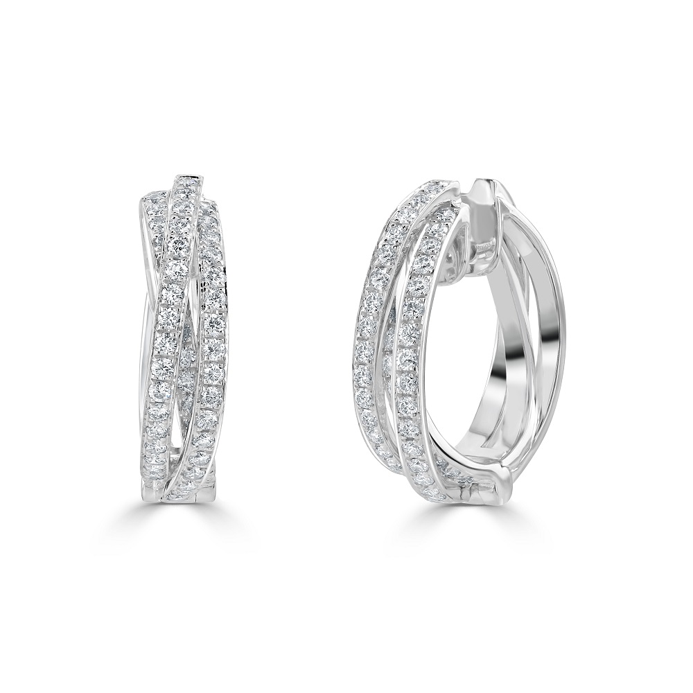Discover the sophisticated allure of our 18ct white gold 3-strand hinged hoop earrings, expertly designed to add a touch of elegance and sparkle to any ensemble. These luxurious earrings feature three distinct strands, each intricately set with round brilliant cut diamonds that total 0.90 carats. The hinged design ensures a secure and comfortable fit, making these earrings perfect for daily wear or special occasions. Crafted from premium 18ct white gold, the earrings offer a sleek and polished finish that beautifully complements the dazzling diamonds. Whether dressing up for a gala or adding a refined touch to your everyday look, these multi-strand diamond hoop earrings are a stunning choice for anyone seeking to elevate their jewellery collection with timeless style and exceptional brilliance.