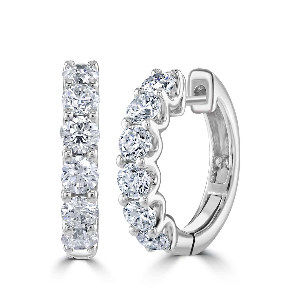 An exquisite pair of 18ct white gold hoop earrings, a testament to timeless elegance and sophisticated design. Each earring is beautifully adorned with six round brilliant cut diamonds, expertly set to showcase their dazzling brilliance and exceptional sparkle. With a total diamond weight of 2.00ct, these earrings radiate luxury and allure, capturing the light from every angle to create a mesmerizing display of shimmer. Crafted from premium 18ct white gold, these hoop earrings offer both durability and a sleek, polished finish that complements the brilliance of the diamonds. The classic hoop design is elevated by the addition of these meticulously selected diamonds, making these earrings a versatile addition to any jewellery collection, perfect for elevating everyday looks or adding a touch of glamour to evening wear.