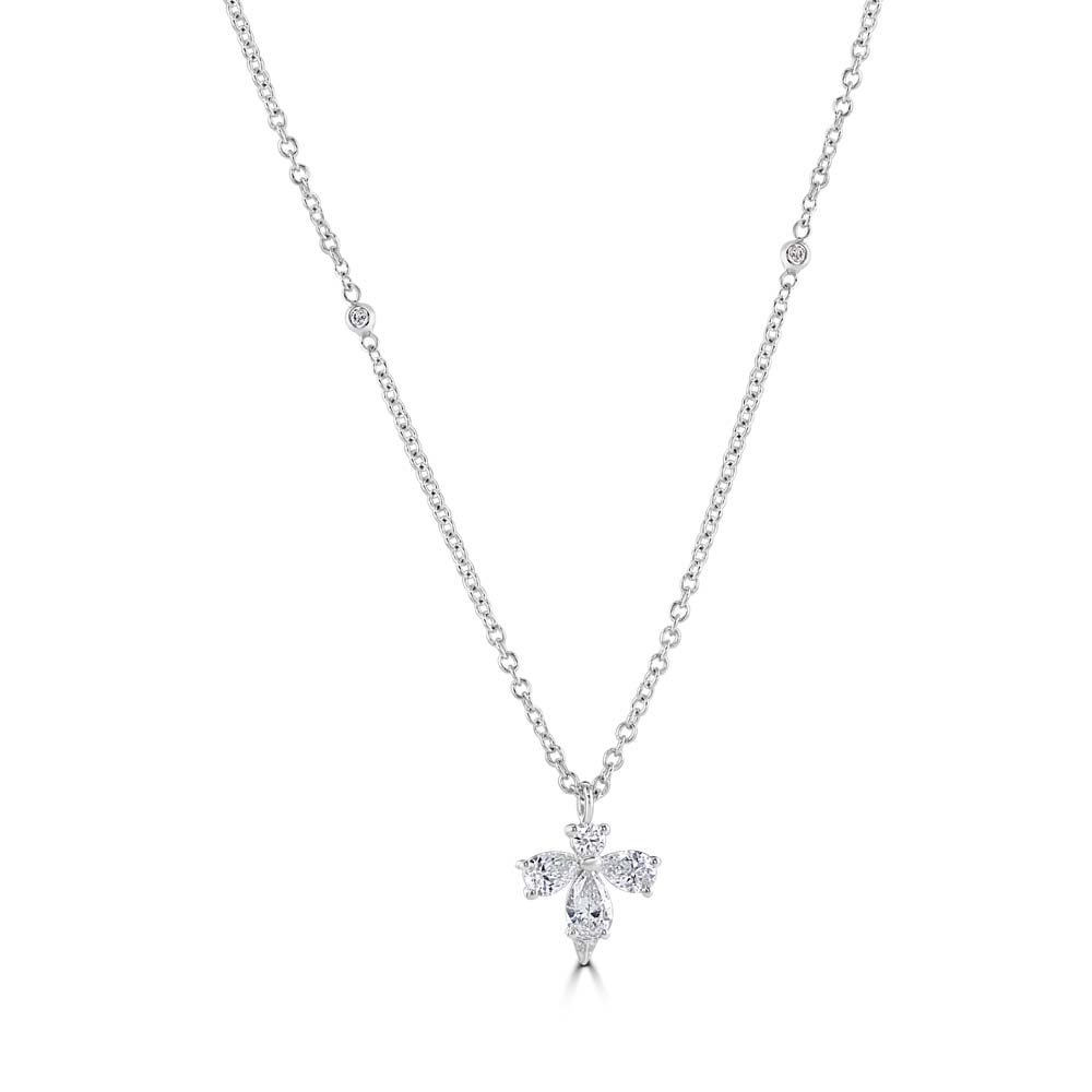Discover our elegant 18ct white gold butterfly-shaped pendant, a true masterpiece of fine jewellery. This enchanting pendant features a delicate butterfly design, adorned with three pear-cut diamonds and three round brilliant-cut diamonds, each meticulously set to enhance their natural brilliance and fire. Suspended from an 18ct white gold 16-inch trace chain, this pendant exudes sophistication and grace. The chain itself is a work of art, embellished with two rubover set round brilliant-cut diamonds that add a touch of sparkle along its length. To complete the look, a single diamond is elegantly set in the lobster clasp, ensuring that every detail of this piece is crafted to perfection. With a total diamond weight of 0.73ct, this pendant is not just a piece of jewellery, but a statement of luxury and timeless beauty. Perfect for special occasions or as a cherished gift, this butterfly pendant will add a touch of glamour to any outfit.