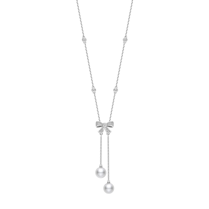 Unveil the epitome of grace and refinement with our 18ct white gold Mikimoto pendant, an exquisite piece that blends classic elegance with intricate detailing. This luxurious pendant features a beautifully diamond-set bow, from which two Akoya cultured pearls, each measuring 7.5mm in diameter, delicately hang. These pearls are suspended from two short pieces of chain, adding a dynamic and elegant movement to the piece. The pendant is strung on a 20-inch adjustable trace chain, crafted in 18ct white gold, and is further embellished with four rubover set round brilliant cut diamonds, totalling 0.28 carats. Designed for versatility, the chain can be adjusted to 18 inches, allowing for perfect placement with any neckline. This pendant captures the essence of Mikimoto's renowned craftsmanship and is ideal for those seeking a statement piece that combines timeless luxury with a modern aesthetic.
