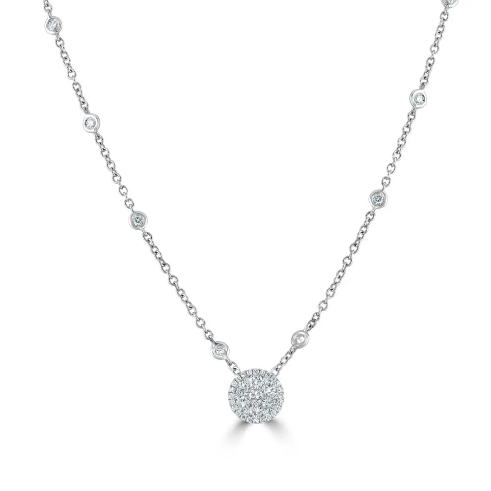 An exquisite 18ct white gold slider pendant, a masterpiece of fine jewellery that showcases intricate craftsmanship and luxurious design. This stunning pendant features a central circle, beautifully set with seven central round brilliant cut diamonds, complemented by six smaller diamonds that elegantly fill the gaps, creating a seamless sparkle. A dazzling halo of additional diamonds encircles this arrangement, enhancing the pendant's overall brilliance. Furthermore, the pendant is suspended from a sophisticated 16-inch white gold trace chain, which itself is rubover set with twelve scattered round brilliant cut diamonds, adding a touch of glamour with every movement. With a total diamond weight of 0.72 carats, this pendant is a perfect blend of elegance and style, making it an ideal choice for special occasions or as a significant gift for someone truly special in your life. Elevate your jewellery collection with this radiant and meticulously designed diamond pendant, a symbol of luxury and timeless beauty.