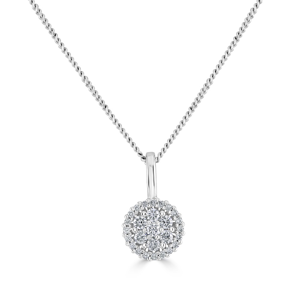 Our stunning 18ct white gold circle pendant features a captivating arrangement of seven round brilliant cut diamonds, elegantly claw-set at the centre. Each diamond is meticulously placed, creating a dazzling focal point. Surrounding these central gems is a halo of additional round brilliant cut diamonds, adding an extra layer of sparkle and luxury. This pendant hangs gracefully from a 16-inch curb chain, providing a perfect drop for any neckline. With a total diamond weight of 0.26 carats, this pendant is a masterpiece of design and craftsmanship, ideal for adding a touch of glamour to any occasion.