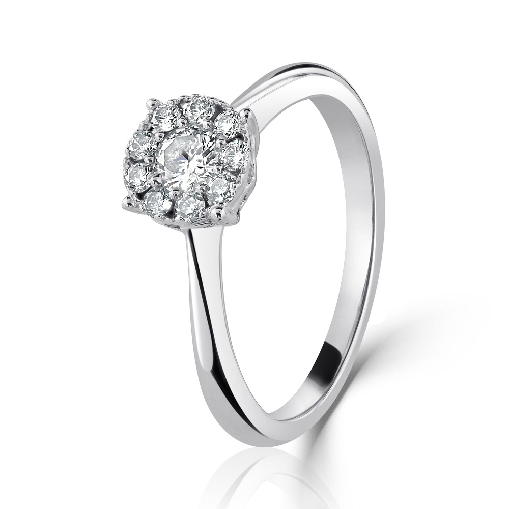 Our 18ct white gold cluster ring has been masterfully designed with a central claw-set round brilliant cut diamond, weighing 0.23ct. This stunning centrepiece is encircled by nine smaller round brilliant cut diamonds, collectively weighing 0.18ct, each meticulously held in place by four external claws for enhanced security and brilliance.