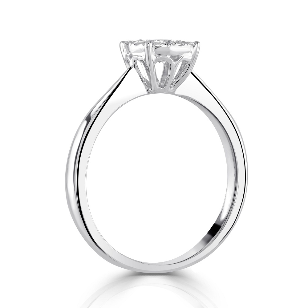 Crafted from premium 18ct white gold, this ring showcases a dazzling arrangement that captures the light from every angle, ensuring a spectacular sparkle that's perfect for any occasion. The sophisticated design combines classic charm with a modern aesthetic, making it a perfect choice for engagements, anniversaries, or as a significant addition to your jewellery collection.