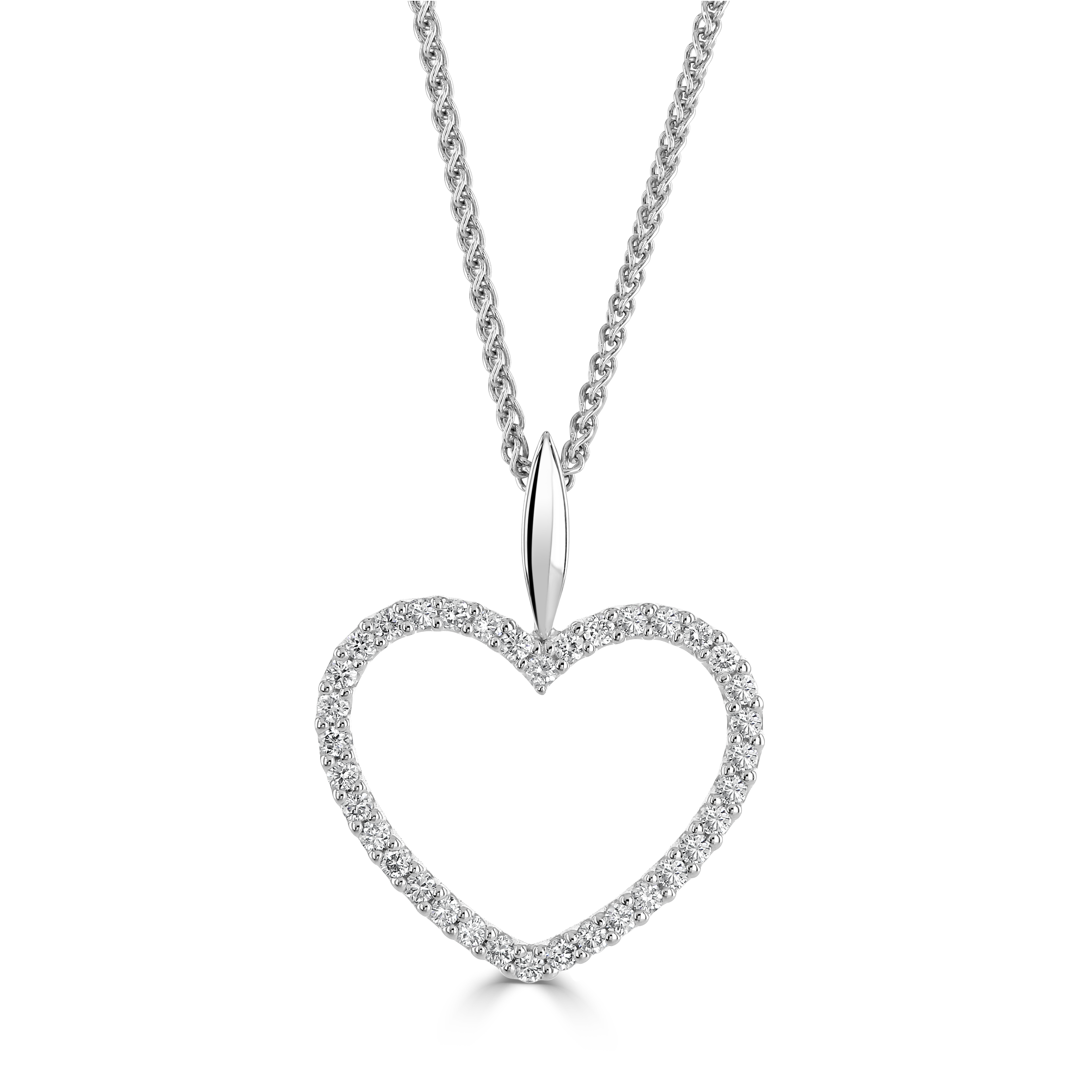A gorgeous 18ct white gold open heart pendant set with sparkling round brilliant cut diamonds suspended from a 16 inch spiga chain. Other variations are available please contact the store for more details.