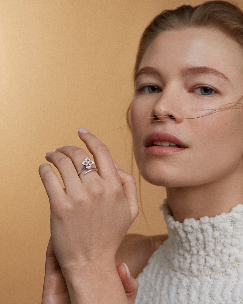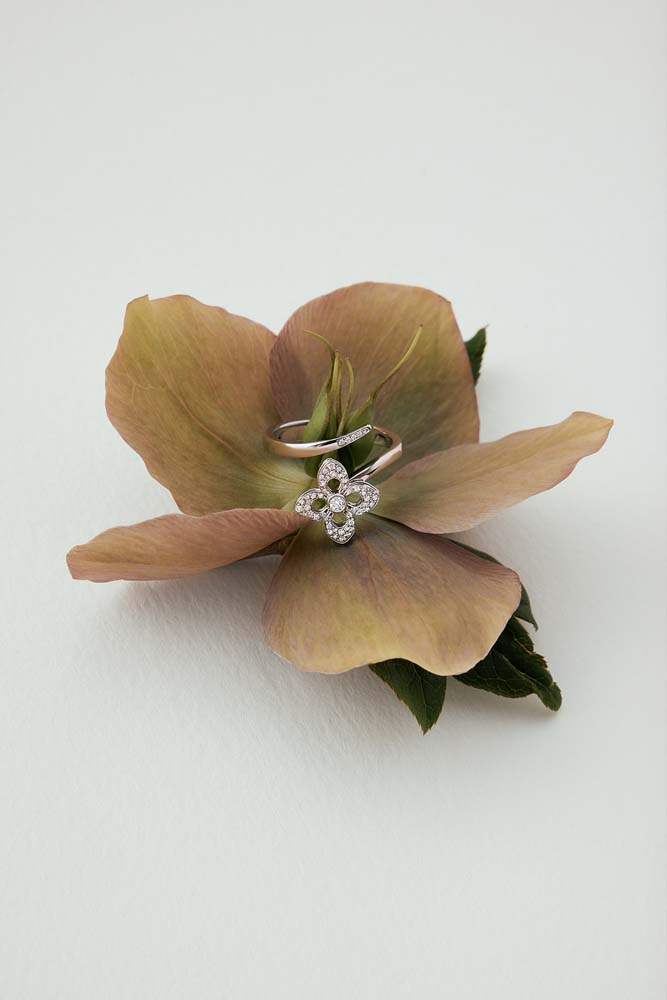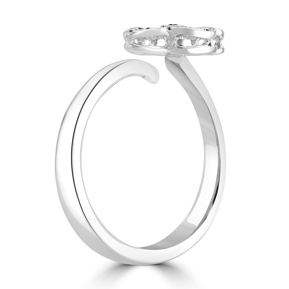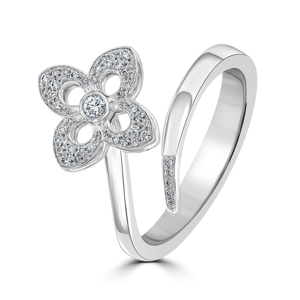 An enchanting 18ct white gold open flower style crossover cluster ring is a stunning creation that epitomizes the essence of spring and renewal. This exquisite ring features a unique open flower design, expertly crafted with a centre rubover set round brilliant cut diamond. This central gem is beautifully surrounded by smaller round brilliant cut diamonds, grain set to form four delicate petals, symbolizing growth and new beginnings. At the other end of the crossover design, more grain-set round brilliant cut diamonds add an extra layer of sparkle, enhancing the ring's intricate detailing and overall allure. Crafted from luxurious 18ct white gold, this ring combines strength and elegance, providing a durable and stylish setting that complements the brilliance of the diamonds perfectly. This piece is inspired by the beauty and vitality of spring, making it an ideal gift for commemorating significant life events such as engagements, anniversaries, or personal milestones.