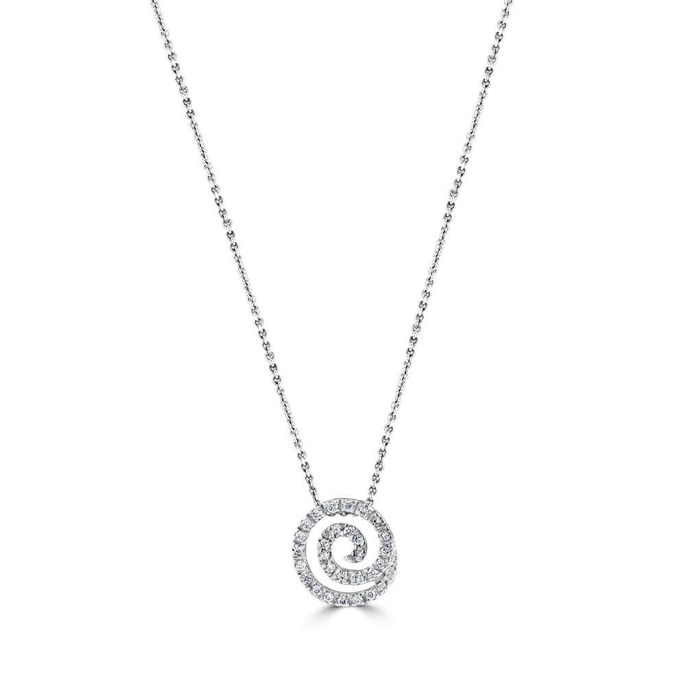 A stunning 18ct white gold swirl shaped pendant, a masterful blend of elegance and intricacy. This exquisite pendant features a beautifully crafted swirl design, set with 29 round brilliant-cut diamonds, totalling 0.30 carats. Each diamond is meticulously placed to enhance the pendant's swirling silhouette, capturing, and reflecting light from every angle for a mesmerizing sparkle. Suspended from a delicate 16-inch trace chain crafted in the same luxurious 18ct white gold, this pendant hangs gracefully at the perfect length to complement any neckline. The sleek and polished finish of the white gold enhances the natural brilliance of the diamonds, creating a sophisticated and eye-catching piece.
