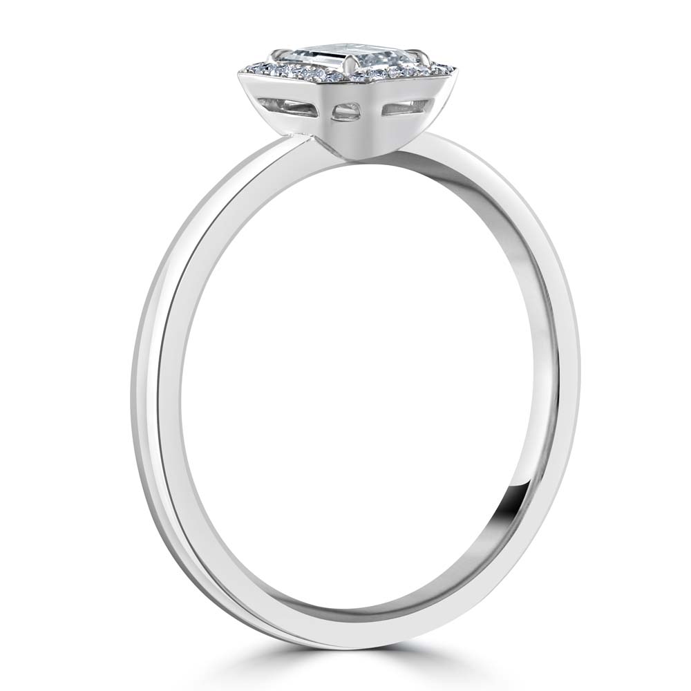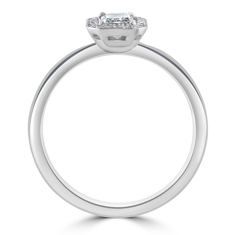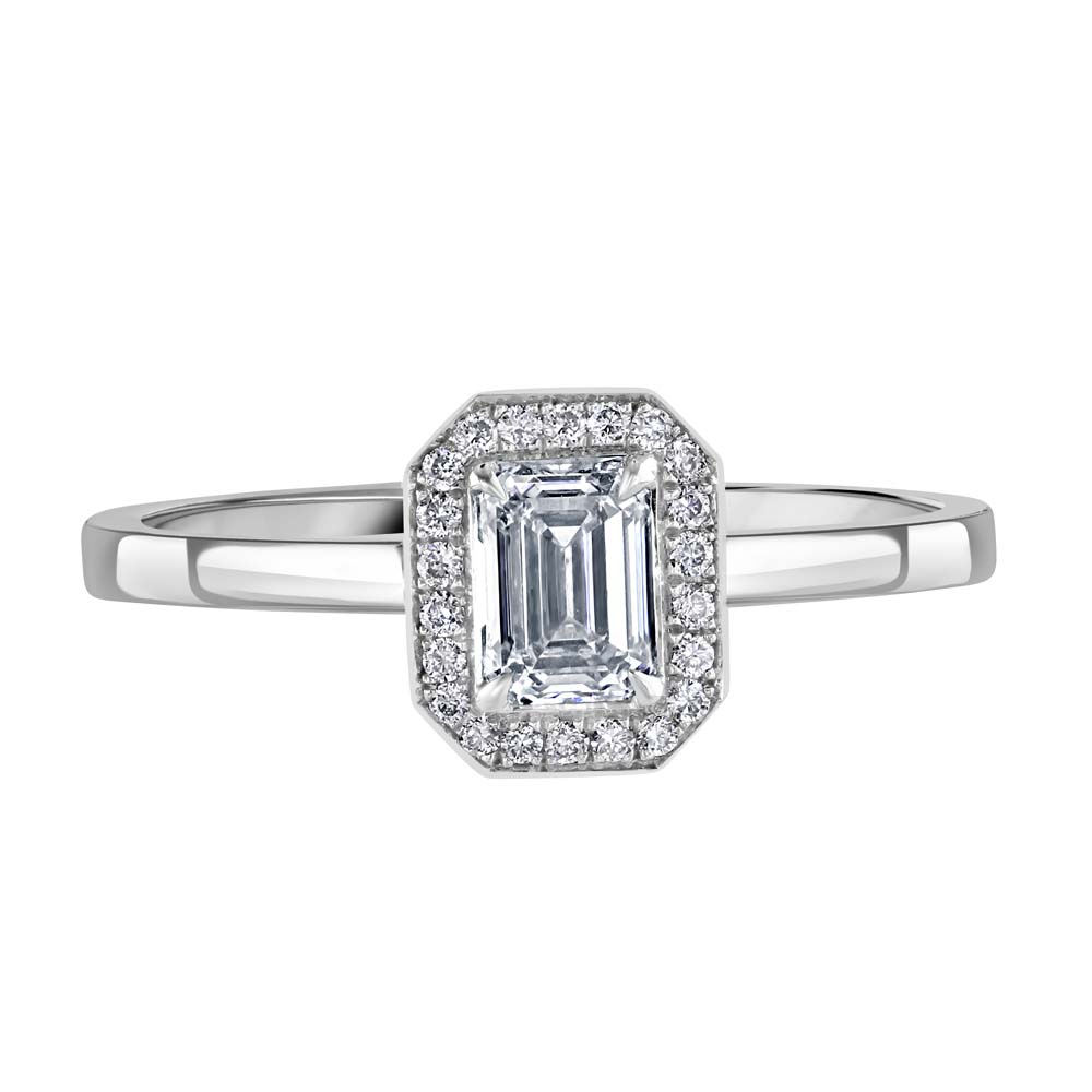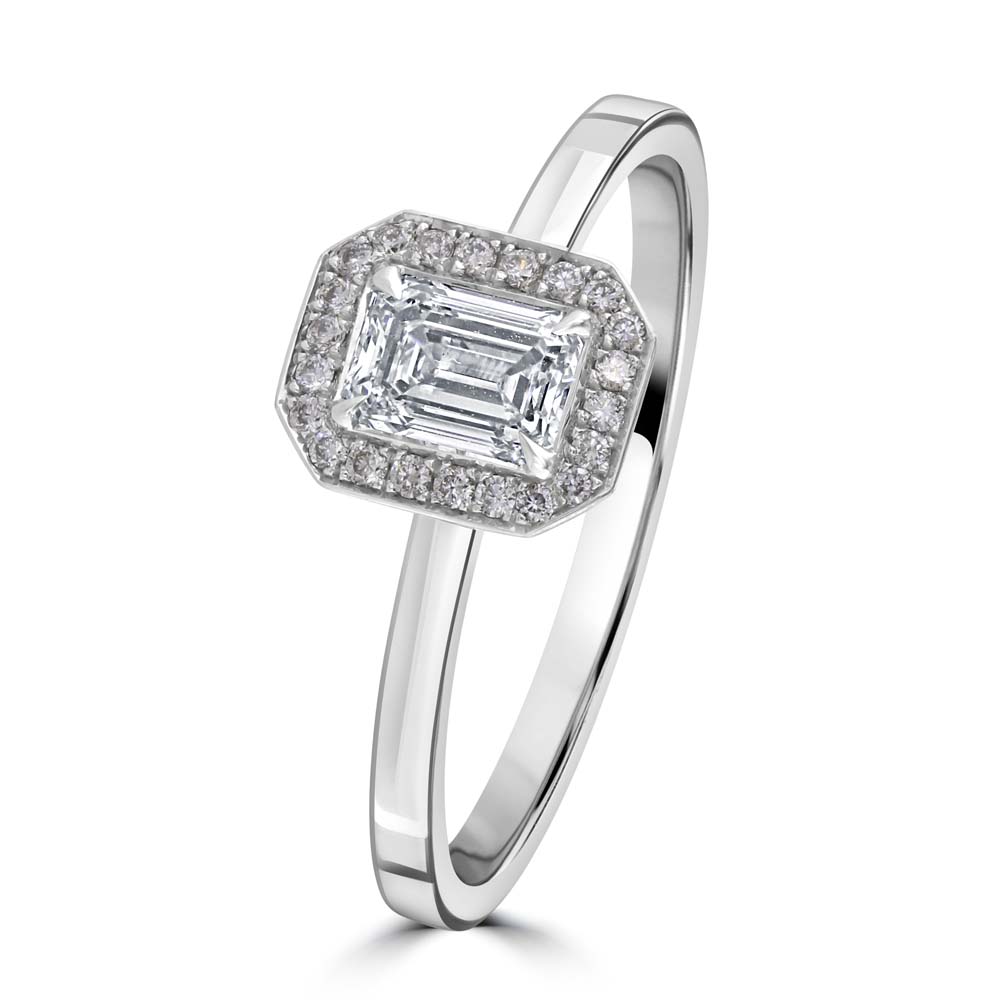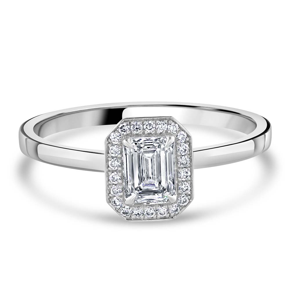 Discover our exquisite 18ct white gold cluster ring, designed to dazzle with its magnificent arrangement of diamonds. At the centre of this stunning piece sits a 0.50ct emerald cut diamond, securely held in a four-claw setting, boasting a G colour and VS1 clarity, reflecting a clear and brilliant sparkle. Surrounding this impressive centrepiece are 22 round brilliant cut diamonds, collectively weighing 0.08ct, each meticulously chosen for their G colour and VS clarity, enhancing the overall radiance and allure of the ring. The cluster of diamonds creates a spectacular halo around the central emerald cut diamond, amplifying its size and brilliance, making this ring a true statement of luxury and elegance. The polished 18ct white gold setting further accentuates the diamonds' sparkle, providing a sleek and sophisticated look that is timeless.