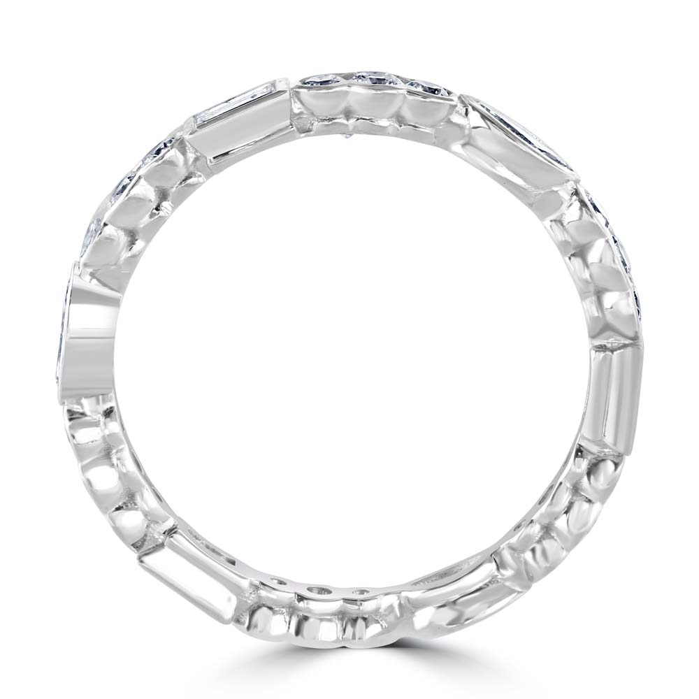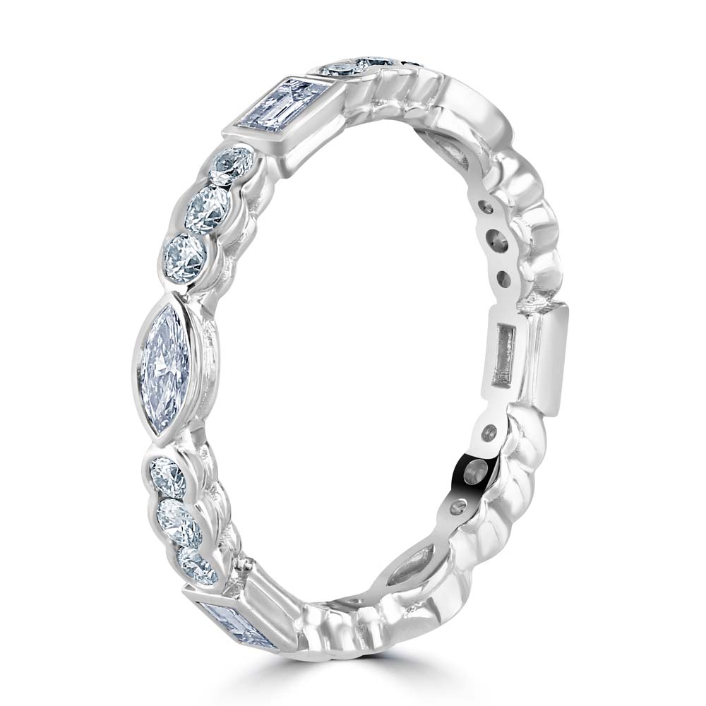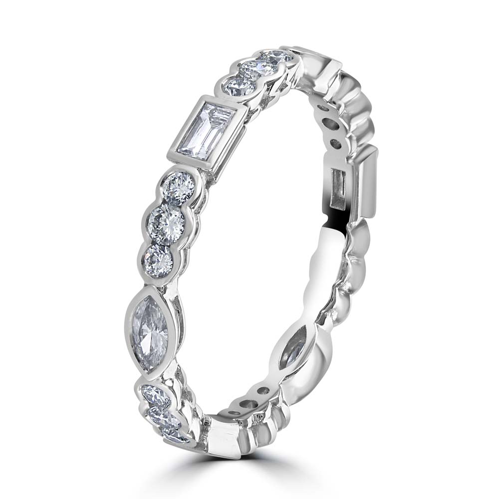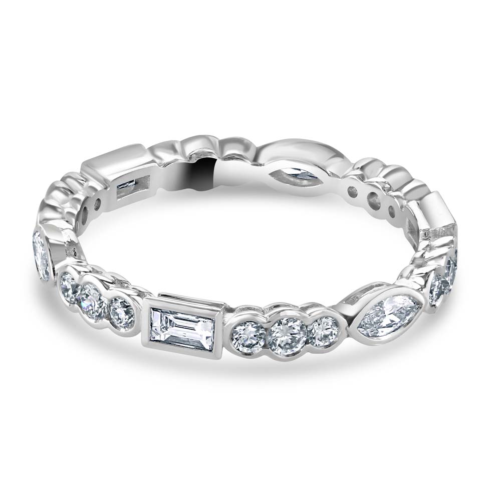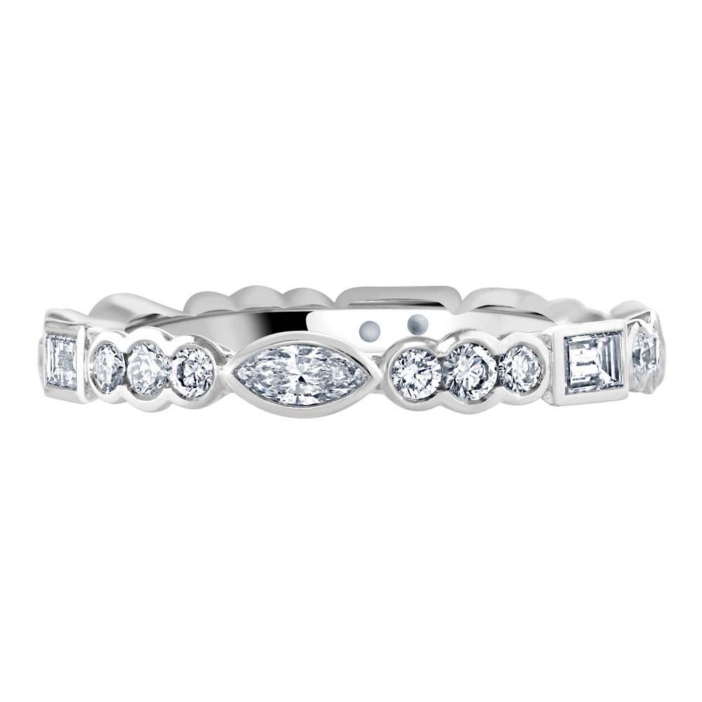 Introducing our stunning 18ct white gold full eternity ring, a masterpiece of craftsmanship and design, featuring an exquisite array of diamonds in varied cuts. This ring showcases a unique combination of three emerald cut diamonds, three marquise cut diamonds, and eighteen round brilliant cut diamonds, all rubover set to enhance their individual beauty and collective brilliance. The full eternity design, with diamonds encircling the band, symbolizes never-ending love, making this ring an ideal choice for anniversaries, weddings, or as a luxurious gift. The warm tones of the rose gold perfectly accentuate the varied diamond cuts, creating a visually captivating piece that is both diverse and harmoniously beautiful.