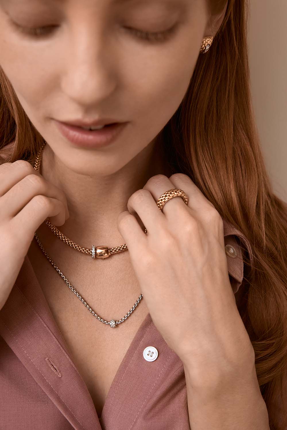 Experience the pinnacle of Italian luxury with the 18ct white gold Flex'It Eka necklace from Fope Gioielli, a stunning showcase of exquisite craftsmanship and innovative design. This elegant necklace features a unique brick link structure that provides a flexible, comfortable fit, making it perfect for daily wear. The highlight of this piece is a single white gold rondel, beautifully pavé-set with sparkling diamonds totalling 0.19 carats, adding a touch of glamour and sophistication. Measuring 50cm in length, this necklace drapes gracefully around the neck, offering a versatile look that can be dressed up or down. Perfect for those who appreciate refined style and the allure of finely set diamonds, this necklace is a standout addition to any fine jewellery collection.