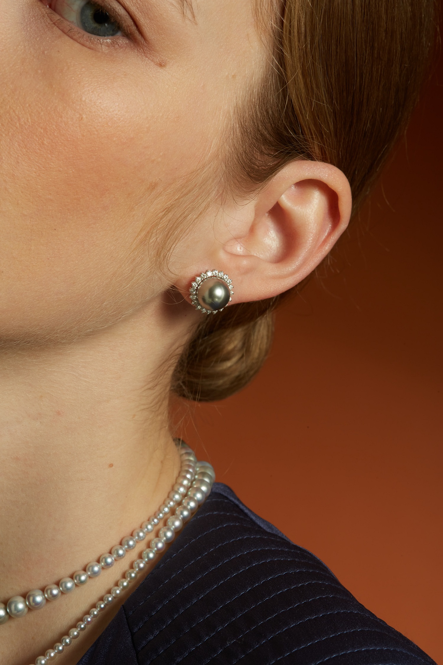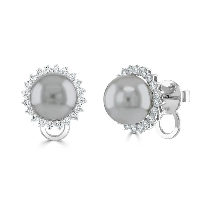 An exquisite pair of 18ct white gold stud earrings, featuring lustrous grey Tahitian pearls encircled by a dazzling cluster of round brilliant cut diamonds. These sophisticated earrings are crafted with a total diamond weight of 0.83ct, ensuring a radiant sparkle that complements the deep, mysterious hues of the pearls. Each pearl measures between 10.0 to 10.5mm in diameter, perfectly sized for an elegant and noticeable presence. The earrings are secured with a post and butterfly fitting, providing a comfortable and reliable closure for everyday wear or special occasions. Perfect for those who appreciate the timeless beauty of pearls with the luxurious sparkle of diamonds, these earrings offer a blend of classic elegance and modern glamour.