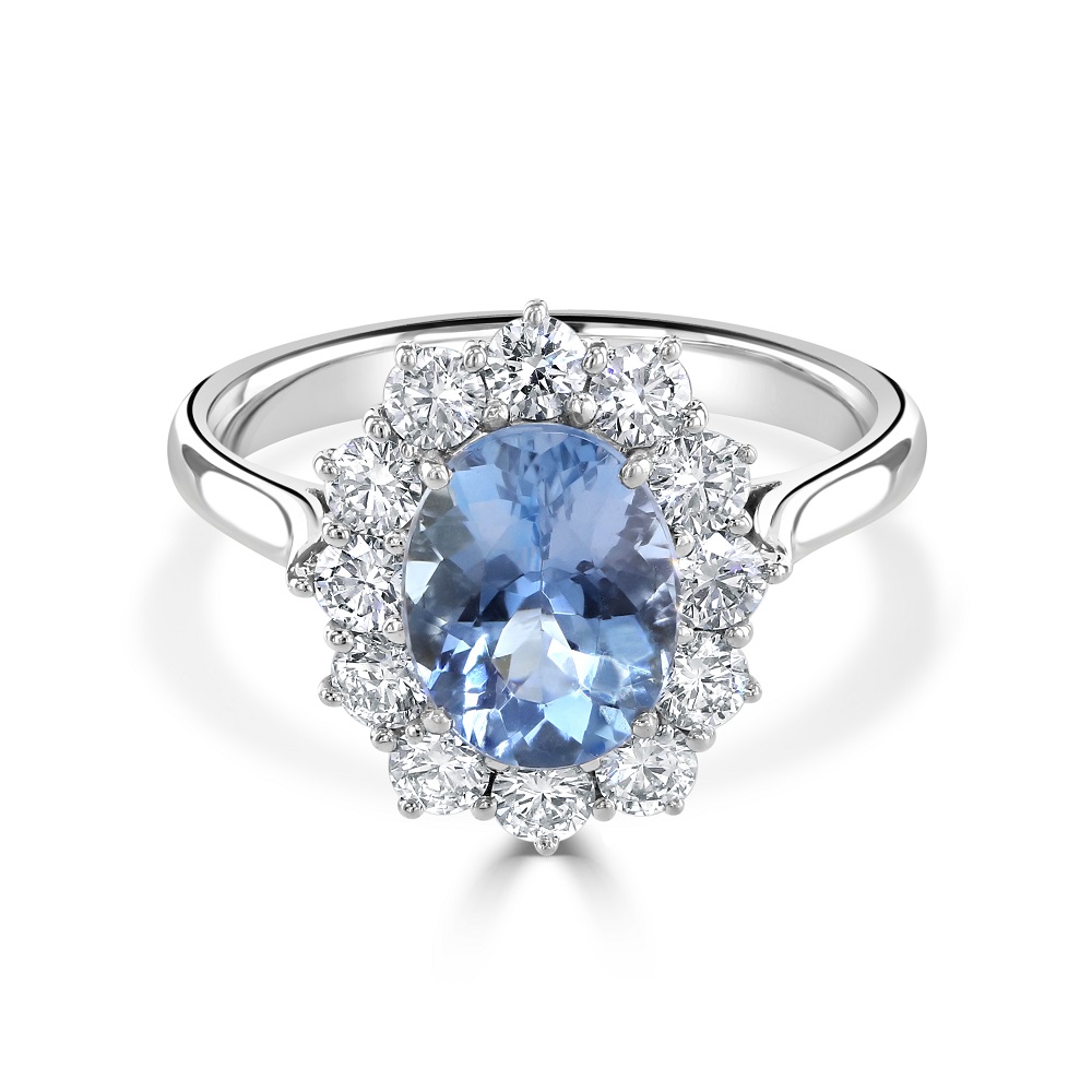An exquisite 18ct white gold aquamarine and diamond ring, a symbol of elegance and refined taste. This stunning piece features a captivating centre stone - an oval-shaped aquamarine, meticulously set with four claws to ensure its radiant blue hue and sparkling clarity are prominently displayed. Weighing in at an impressive 1.78ct, the aquamarine exudes tranquillity and serenity, making it not just a jewel but a piece of wearable art. Encircling the serene beauty of the aquamarine are 12 round brilliant-cut diamonds, collectively weighing 0.83ct. These diamonds create a dazzling halo that enhances the aquamarine's natural allure. Set in luxurious 18ct white gold, this ring offers a sleek and contemporary look, making it a versatile addition to any outfit, from casual daywear to elegant evening attire.