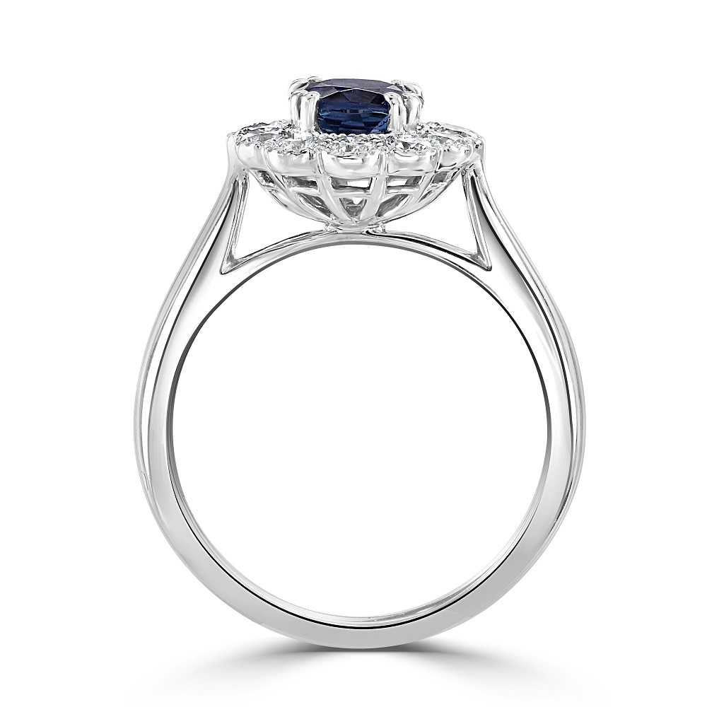 Introducing our captivating 18ct white gold cluster ring, a luxurious blend of vibrant colour and dazzling brilliance. At the centre of this exquisite piece sits a stunning oval cut blue tourmaline, weighing 0.97 carats, securely held by a claw setting. This vivid gemstone is encircled by twelve meticulously rubover set round brilliant cut diamonds, totalling 0.54 carats. Each diamond is framed with a delicate milgrain edge, adding a touch of vintage elegance to the modern design. Crafted from high-quality 18ct white gold, this ring offers a lustrous finish that enhances the natural beauty of the tourmaline and the sparkle of the diamonds. Perfect for those who appreciate sophisticated jewellery with a statement gemstone, this cluster ring is ideal for special occasions or as an exquisite addition to any fine jewellery collection.