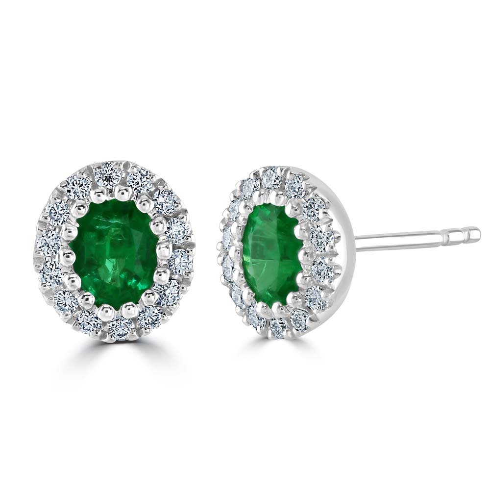 A stunning pair of 18ct white gold stud earrings, each featuring a mesmerizing oval-cut emerald at its heart, totalling 0.51ct. These vibrant emeralds are securely held in place by precise claw settings, highlighting their lush green hues and natural beauty. Surrounding each emerald, a cluster of 14 meticulously selected round brilliant-cut diamonds, with a total weight of 0.18ct, adds an exquisite frame of sparkling radiance.
