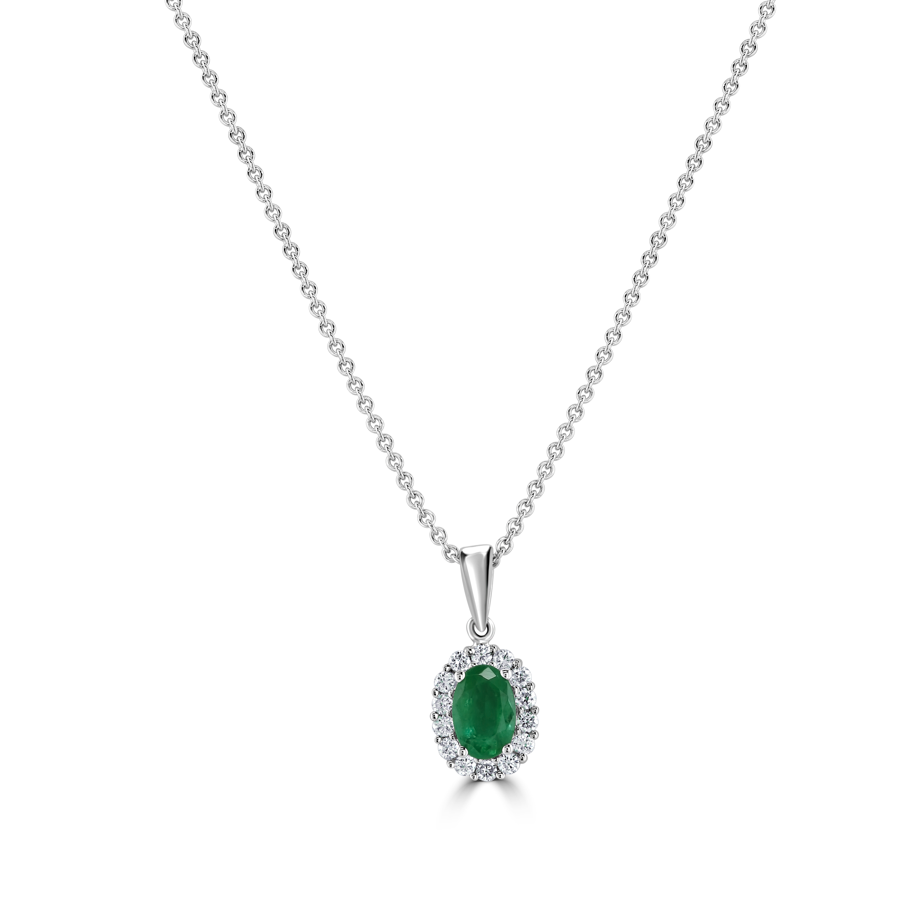 An elegant 18ct white gold pendant exuding timeless beauty. The centrepiece of this exquisite design is an oval cut emerald, renowned for its deep, vibrant green hue, symbolizing both luxury and grace. Encircling this striking emerald is a halo of round brilliant cut diamonds, each catching the light to enhance the emerald's natural lustre. The pendant is suspended from an 18ct white gold 18 inch trace chain, which is adjustable to 16 inches, offering versatility and comfort.
