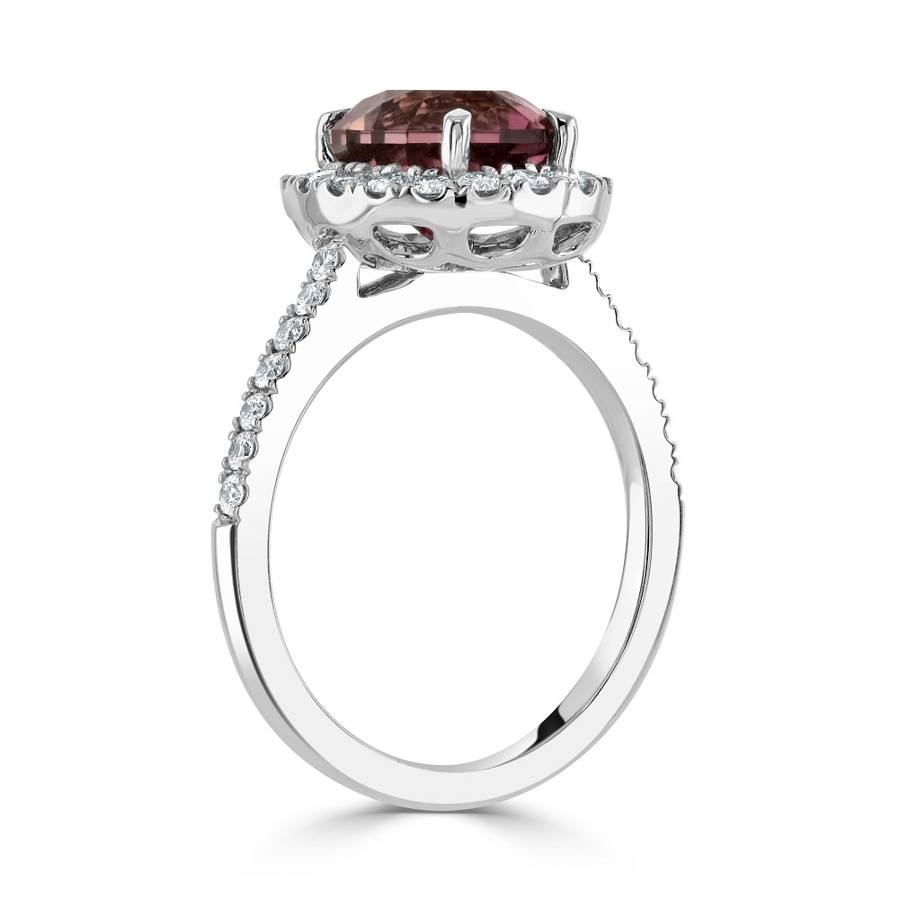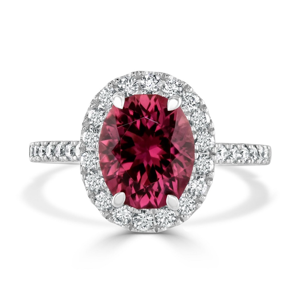Introducing our stunning 18ct white gold halo ring, a true masterpiece that marries vivid colour with sparkling brilliance. At the centre of this exquisite ring sits a four-claw set oval-shaped pink tourmaline, weighing an impressive 2.84 carats, known for its captivating hue and depth. Surrounding the tourmaline is a halo of meticulously set round brilliant cut diamonds, enhancing the vibrant pink with their clear, radiant sparkle. Additional diamonds extend along the shoulders of the ring, bringing the total diamond weight to 0.62 carats. Crafted from luxurious 18ct white gold, this halo ring combines timeless elegance with contemporary design, making it an ideal choice for those who appreciate bold, statement jewellery. Perfect for special occasions or as a standout addition to any jewellery collection, this ring is sure to turn heads and capture hearts.