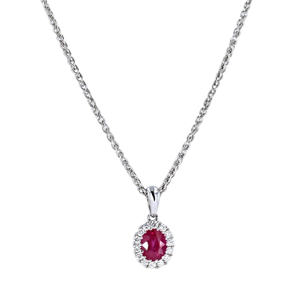 An elegant 18ct white gold pendant, featuring a central claw-set oval-shaped ruby, weighing 0.48 carats. This vibrant ruby is beautifully framed by 16 pavé-set round brilliant cut diamonds, totalling 0.11 carats, adding a luxurious sparkle that enhances the rich red gemstone. The pendant is elegantly suspended from a plain loop on an 18-inch rhodium-plated spiga chain, also crafted in 18ct white gold, providing both durability and a sophisticated sheen. Perfect for special occasions or as a stunning gift, this pendant exudes timeless elegance and is designed to be a cherished addition to any fine jewellery collection.