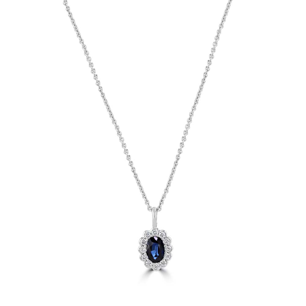 Elevate your elegance with this stunning 18ct white gold pendant. At its centre, a captivating oval cut sapphire is securely set in a classic claw setting, exuding timeless beauty and sophistication. Surrounding the sapphire are twelve round brilliant-cut diamonds, each meticulously rubover set to enhance their brilliance. The total diamond weight is 0.18ct, adding a delicate yet dazzling sparkle to the piece. The pendant is suspended on an 18-inch trace chain crafted from 18ct white gold, providing a secure and stylish fit. The cool, lustrous tone of the white gold beautifully complements the deep blue of the sapphire and the radiant diamonds, creating a piece that is both elegant and versatile. Whether you're dressing up for a special occasion or adding a touch of luxury to your everyday look, this pendant is the perfect accessory to elevate any outfit.