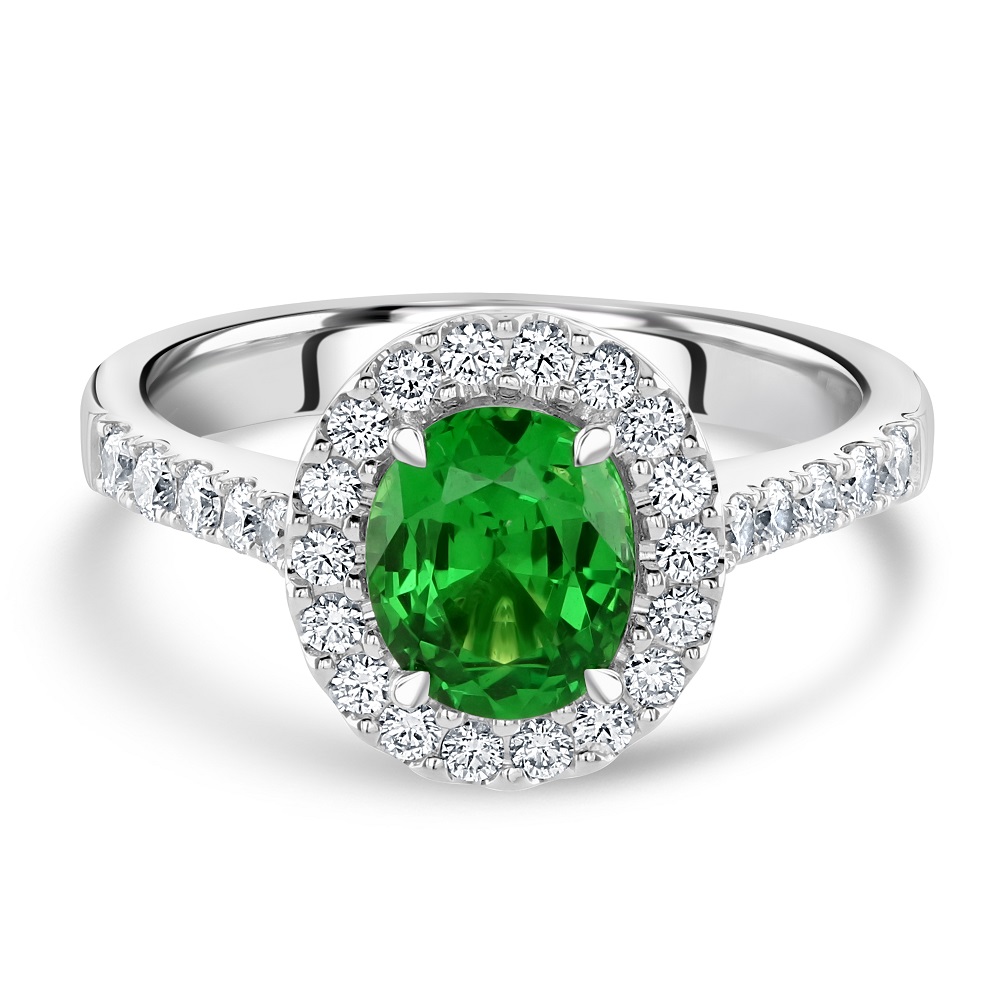 Introducing our stunning 18ct white gold cluster ring, a masterpiece of luxury that combines vivid colour with sparkling brilliance. At the heart of this exquisite ring lies a captivating 1.42ct oval tsavorite, securely held by a four-claw setting. This rare gemstone is renowned for its deep, rich green colour, offering a striking contrast against the sleek white gold. Encircling the tsavorite is a halo of round brilliant cut diamonds, adding an extra layer of luminosity with a total diamond weight of 0.45 carats. The ring's shoulders are also adorned with set diamonds, enhancing the overall sparkle and making this piece truly stand out. Crafted with meticulous attention to detail, this cluster ring is perfect for those who appreciate sophisticated elegance with a touch of unique allure, making it an ideal choice for special occasions or as a standout addition to any jewellery collection.