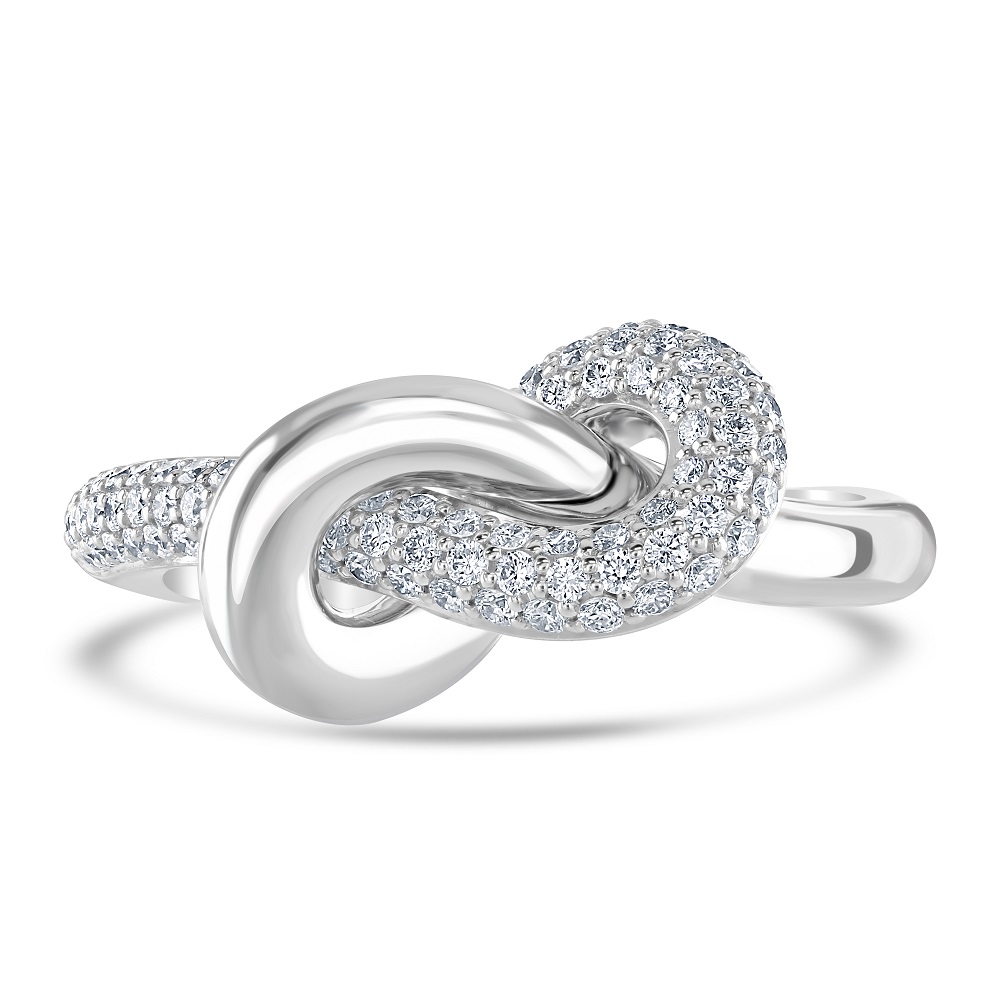 Introducing our sophisticated 18ct white gold knot ring, a symbol of endless elegance intricately crafted for those who cherish unique design. This exquisite ring features a knot motif, half pavé set with sparkling round brilliant cut diamonds that total 0.58 carats. The design represents unbreakable bonds and is enhanced by the brilliant sparkle of meticulously placed diamonds, adding a touch of luxury and timeless appeal. Crafted from premium 18ct white gold, this ring offers a sleek and polished finish that enhances its sophisticated silhouette. Perfect for an engagement, anniversary, or as a meaningful gift, this knot ring is a stunning choice for anyone seeking a piece that combines classic symbolism with contemporary style.