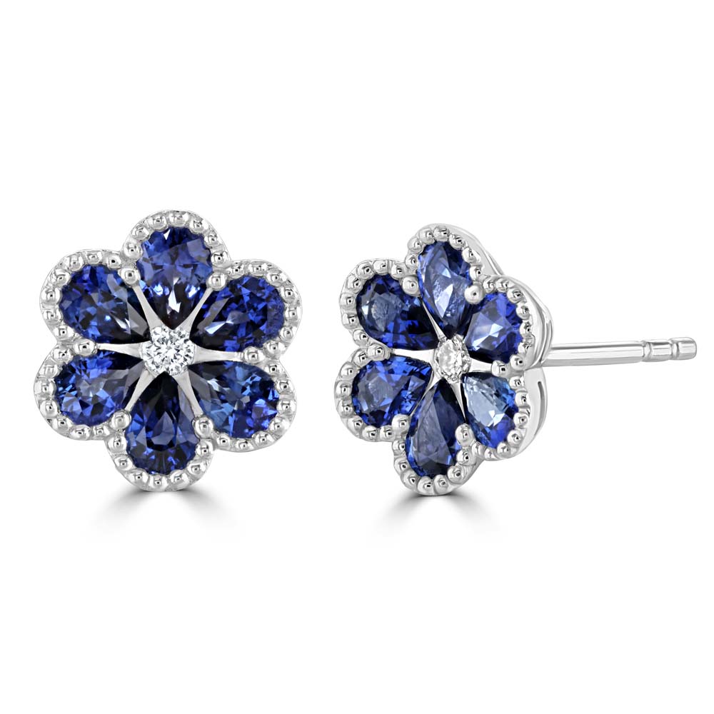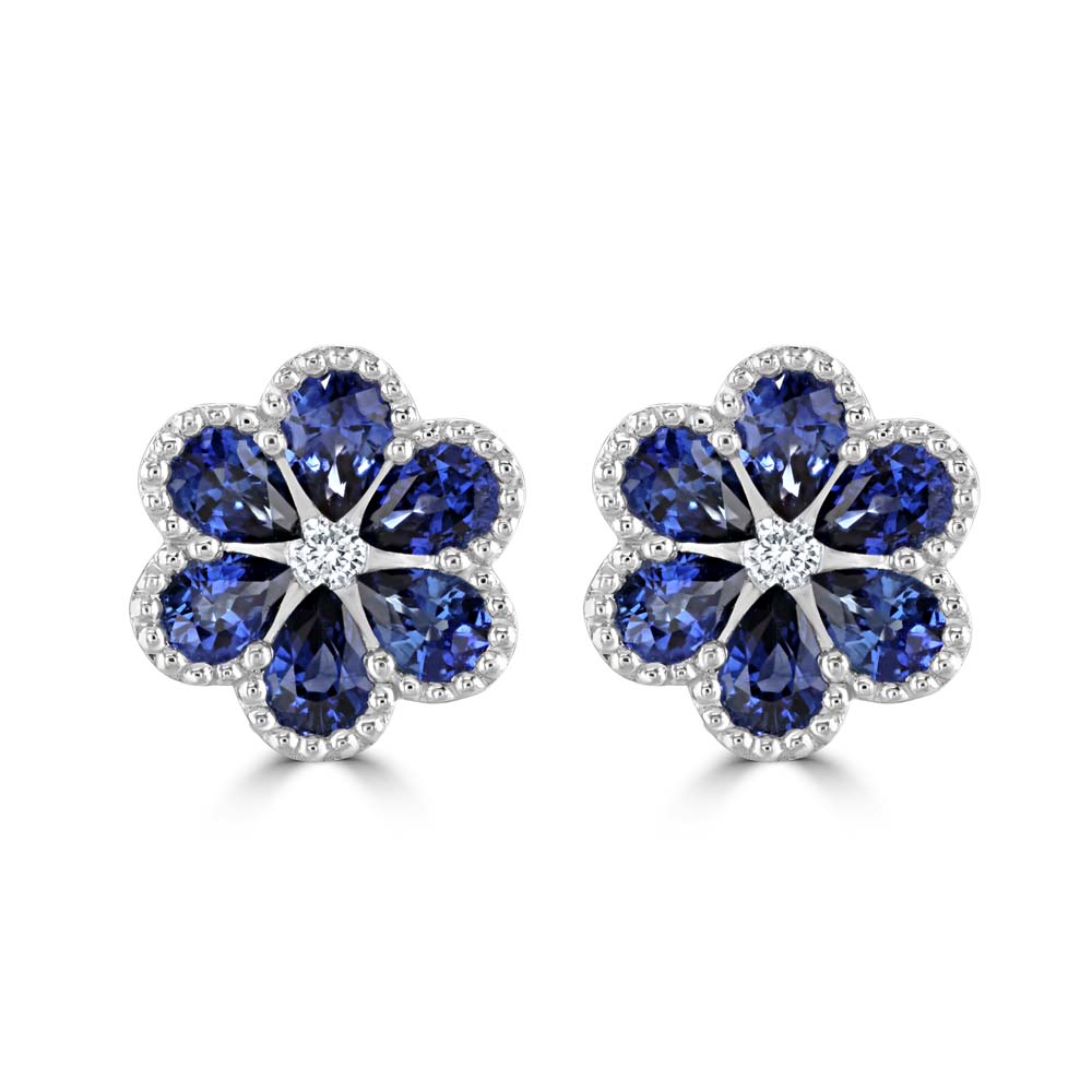 Celebrate timeless elegance with these beautifully crafted 18ct white gold stud earrings, featuring a delicate floral design that blends classic charm with refined luxury. Each earring showcases six pear cut sapphires, arranged to form graceful petals around a central round brilliant cut diamond, creating a radiant bloom of colour and sparkle. With a total sapphire weight of 1.28cts and diamond weight of 0.05cts, these earrings offer a subtle yet striking brilliance. The design is enhanced by a vintage-inspired milgrain edge, adding texture and sophistication to the overall look. Finished with post and butterfly fittings, they provide secure and comfortable wear for pierced ears.