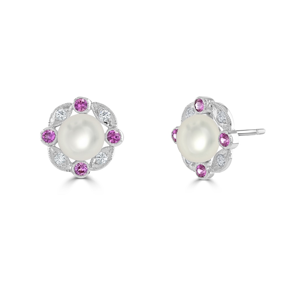Our elegant 18ct white gold stud earrings are a blend of classic charm and contemporary glamour. These luxurious earrings feature a stunning centre pearl, symbolizing purity and grace, beautifully encircled by an alternating arrangement of four round brilliant cut diamonds and four pink sapphires.