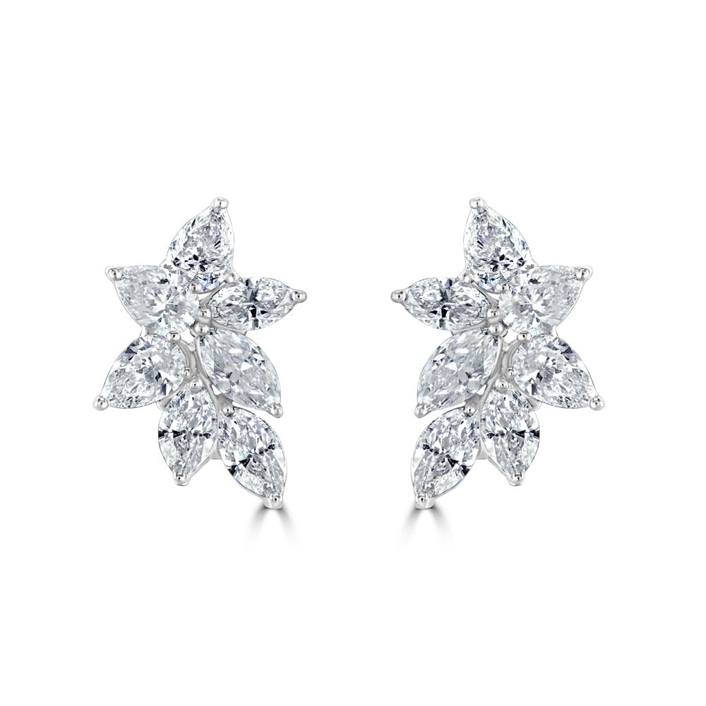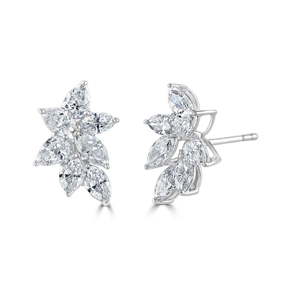 Indulge in the brilliance of these breathtaking 18ct white gold diamond stud earrings, masterfully crafted to showcase a dazzling cluster of seven claw-set diamonds in a harmonious blend of pear cut and marquise cut stones. This elegant arrangement creates a radiant floral-inspired silhouette, offering exceptional sparkle and sophistication. With a total diamond weight of 1.98cts, these earrings are a true statement of luxury, perfect for elevating both everyday style and formal occasions. Designed with post and butterfly fittings, they ensure secure and comfortable wear for pierced ears.