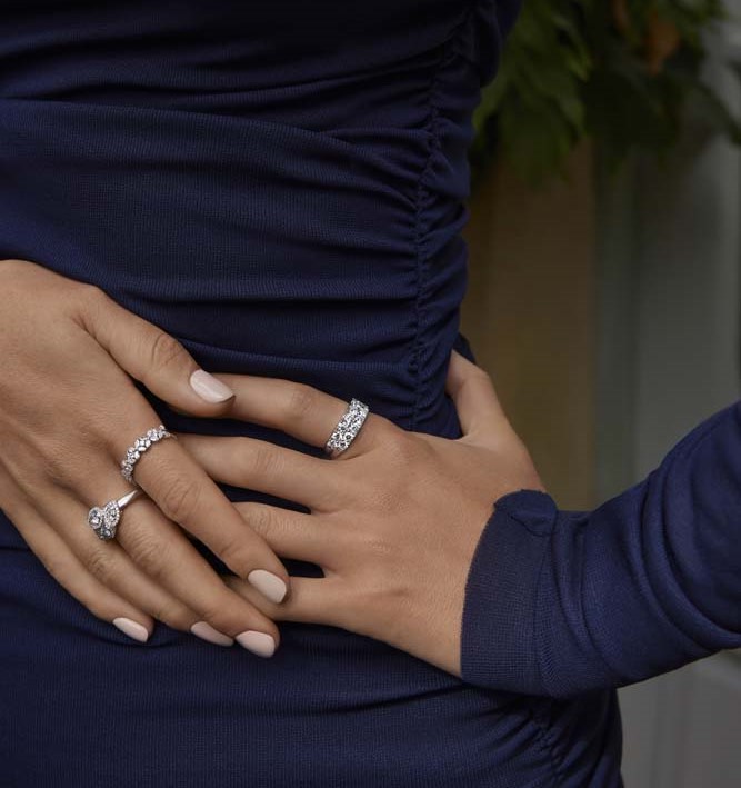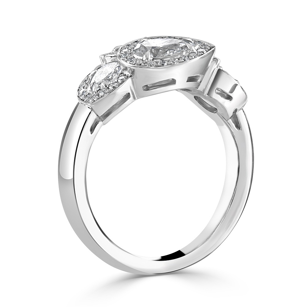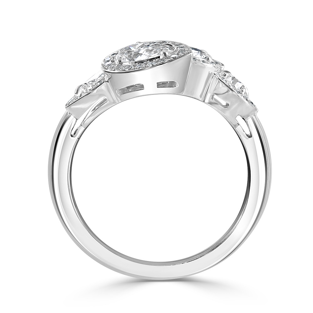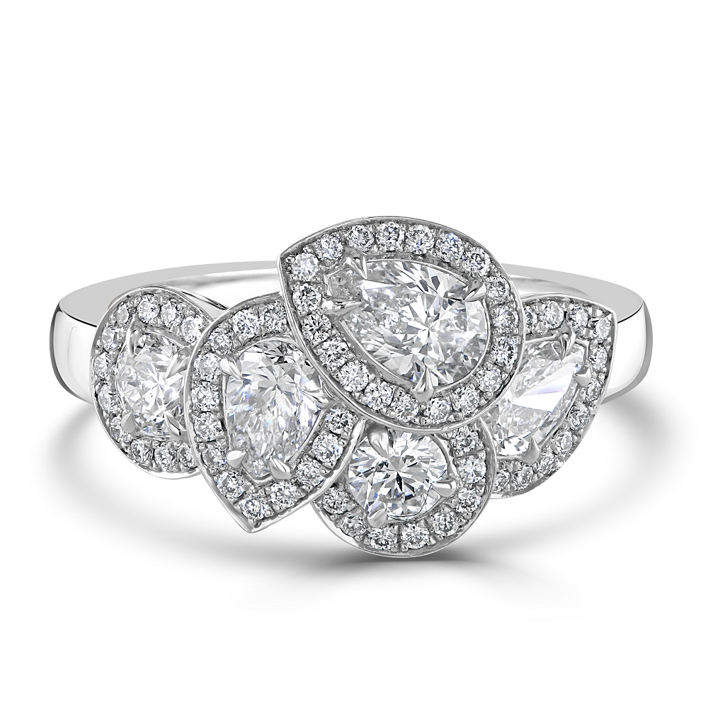 A stunning 18ct white gold asymmetrical multi-cluster ring, a masterpiece of modern elegance and sophisticated design. This exquisite ring features an artful arrangement of three pear-shaped brilliant cut diamonds and two round brilliant cut diamonds, each individually claw set to showcase their unique beauty and brilliance. These centre diamonds, with a combined weight of 1.29ct, serve as the focal point of this remarkable piece, offering a dazzling display of light and luxury.