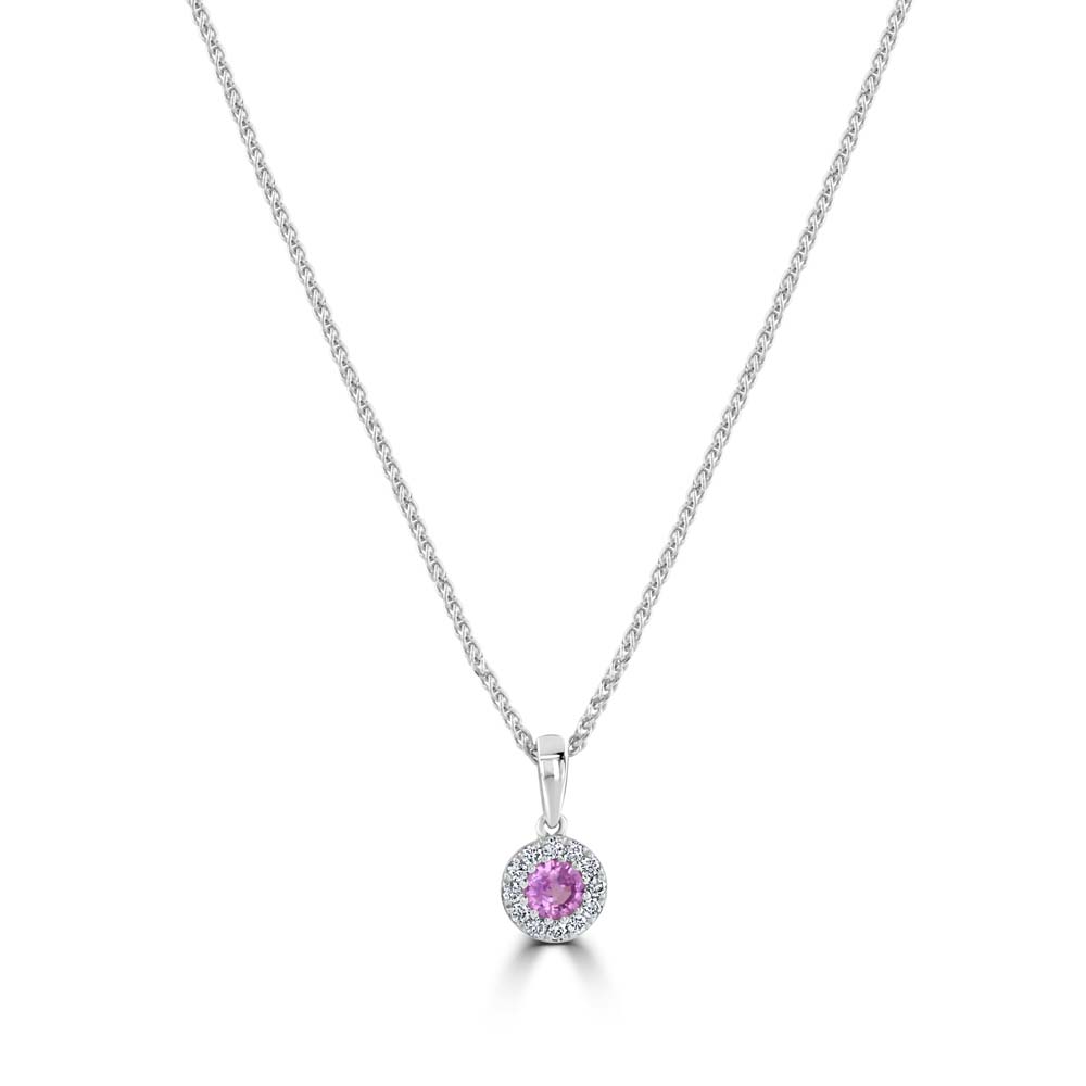 Our elegant 18ct white gold pendant is exquisitely crafted to capture the essence of sophistication and charm. This pendant features a captivating round pink sapphire at its centre, weighing 0.26ct. The sapphire's vibrant pink hue offers a striking contrast against the gleaming white gold, making it a standout piece for any occasion. The central gemstone is beautifully encircled by twelve round brilliant cut diamonds, totalling 0.13ct. These diamonds are meticulously set to enhance the pink sapphire with a radiant halo, adding an exquisite sparkle that draws the eye. This luxurious pendant is elegantly suspended from an 18-inch 18ct white gold spiga chain, known for its durability and classic woven texture. The chain complements the pendant perfectly, ensuring that it sits gracefully at the neckline. Perfect for special occasions or as an elegant everyday accessory, this pendant is a versatile addition to any jewellery wardrobe. It makes an excellent gift for someone special or as a well-deserved treat for yourself.