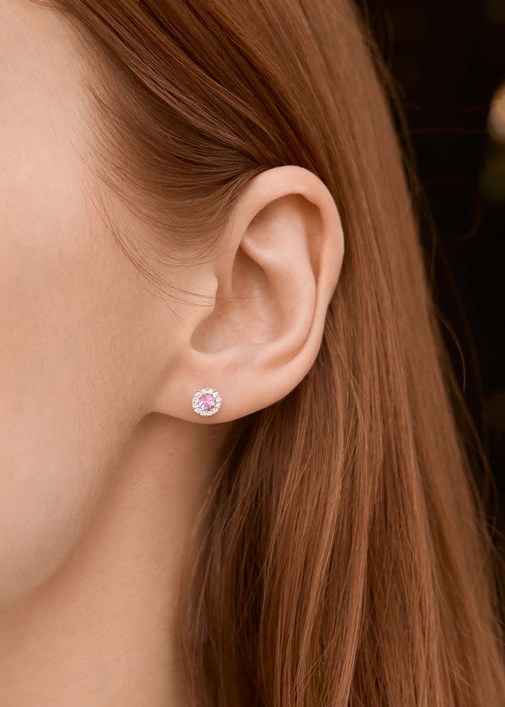 An elegant pair of 18ct white gold stud earrings, designed to bring a touch of sophistication to any attire. These exquisite earrings feature a captivating round pink sapphire at the centre, with a total weight of 0.36ct. The soft hues of the pink sapphires offer a unique and charming allure, setting these earrings apart from traditional pieces. Encircling each sapphire, twelve round brilliant cut diamonds create a dazzling halo, adding an extra layer of brilliance and luxury. The diamonds collectively weigh 0.17ct, providing a stunning contrast to the pink centrepiece and enhancing the overall sparkle of the earrings. Crafted in sleek 18ct white gold, these stud earrings merge durability with a pristine finish, making them a perfect choice for both everyday elegance and special occasions. The combination of the vibrant pink sapphire with the clear, shimmering diamonds makes these earrings a must-have for those who appreciate timeless beauty and exquisite craftsmanship. Ideal for adding a pop of colour and sophistication to your look, these stud earrings are perfect for anyone seeking a blend of modern charm and classic elegance. Whether as a thoughtful gift or a personal indulgence, these earrings are sure to be a beloved addition to any jewellery collection.