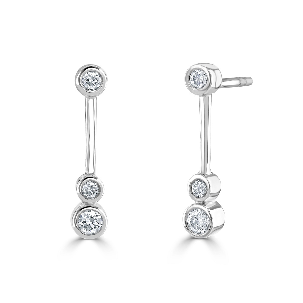 Our 18ct white gold drop stud earrings are a perfect blend of classic charm and contemporary design. Each earring features a beautifully crafted drop style, starting with a single round brilliant-cut diamond set in a secure rubover setting at the post. Extending gracefully below, a sleek short bar holds two additional diamonds, also rubover set, creating a cascading effect that enhances their sparkle.