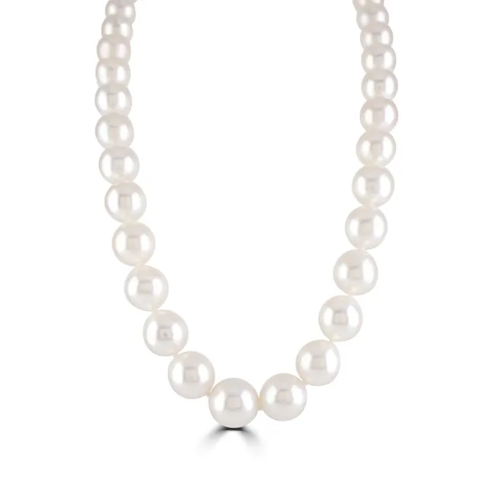 Discover the unmatched elegance of our single row South Sea pearl necklace, a stunning piece that epitomizes luxury and sophistication. This exquisite necklace features a carefully selected row of 35 graduating South Sea pearls, each pearl meticulously chosen for its lustre and quality, ranging impressively in diameter from 10.0mm to 13.0mm. Secured with an 18ct white gold ball clasp, this necklace offers both beauty and safety, ensuring that the pearls are held firmly while adding a modern touch with its polished finish. The substantial size and radiant sheen of the South Sea pearls make this piece a remarkable choice for any high-end jewellery collection. Ideal for gala events, important milestones, or as a cherished gift, this pearl necklace exudes a timeless elegance that is sure to command attention. Embrace the luxury of South Sea pearls and the craftsmanship of fine jewellery with this breathtaking necklace, a true symbol of grace and sophistication.