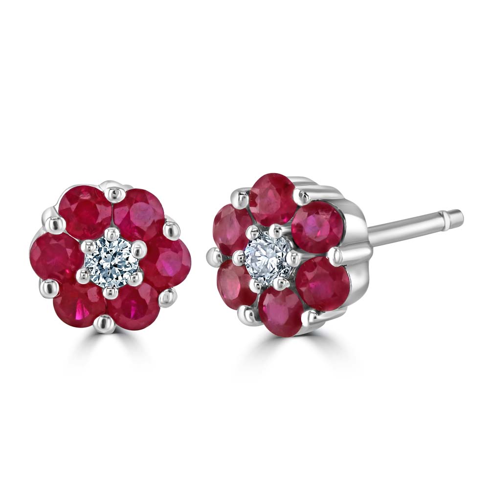 These exquisite stud earrings, crafted from 18ct white gold, present a captivating and luxurious design. At the centre of each earring, a round brilliant cut diamond is showcased, securely held in place by six claws. Surrounding each central diamond are six round rubies, each also claw set. These rubies are chosen for their rich, deep red hue, creating a striking contrast against the diamond's sparkling brilliance. The combination of the radiant diamond and the vibrant rubies, set against the polished white gold backdrop, forms an enchanting floral motif. The earrings are equipped with post and butterfly fittings, ensuring a comfortable and secure fit.