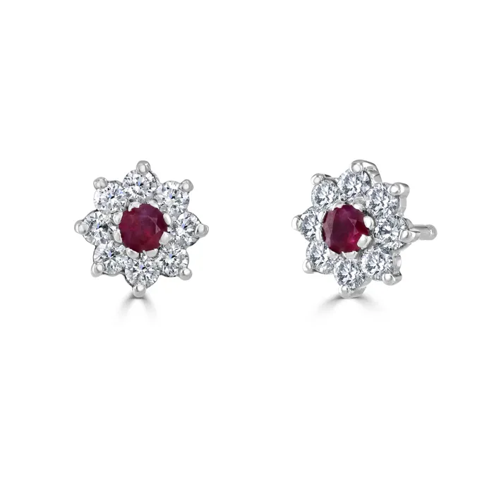 Elevate your style with our exquisite 18ct white gold stud earrings, featuring a mesmerizing centre claw-set round ruby, each approximately weighing 0.30 carats. These rubies, known for their deep red hue, exude elegance and are beautifully complemented by eight claw-set round brilliant-cut diamonds, totalling 0.64 carats. The diamonds are arranged in a graceful flower shape around each ruby, enhancing the design with a radiant sparkle that mirrors the natural beauty of blossoms. Crafted from lustrous 18ct white gold, these stud earrings merge timeless appeal with sophisticated floral aesthetics, making them perfect for any occasion, from daily wear to more festive events. Ideal for those who cherish elegant and meaningful jewellery, these earrings are sure to be a standout addition to any collection.