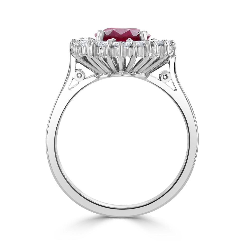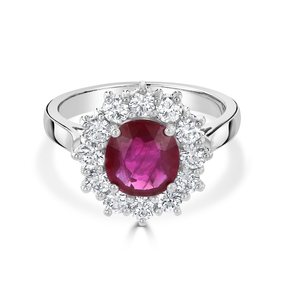 A stunning 18ct white gold oval ruby and diamond cluster ring, a masterpiece of elegance and timeless design. At the heart of this exquisite ring sits a captivating 1.65ct oval ruby, its deep, vibrant red hue symbolizing passion and luxury. Surrounding this magnificent centrepiece, twelve meticulously claw-set diamonds totalling 0.86ct encircle the ruby in a dazzling display of brilliance, creating a breathtaking halo effect.