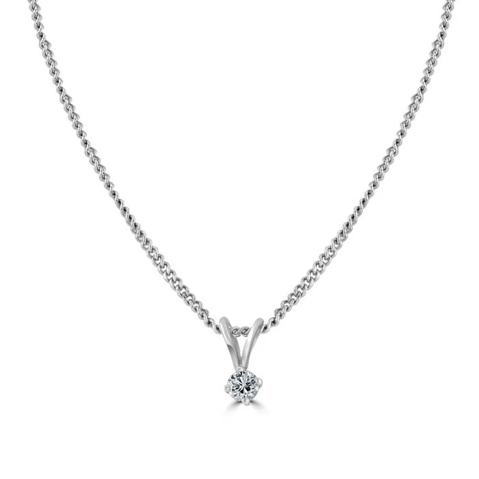 Discover the pure elegance of our 18ct white gold single stone pendant, featuring a dazzling round brilliant cut diamond, perfectly four claw-set to showcase its stunning beauty. This classic diamond pendant has a total weight of 0.20 carats, providing just the right amount of sparkle to catch the eye. The diamond hangs gracefully from a split loop, adding a unique, modern twist to the timeless pendant design. This detail not only enhances the visual appeal of the pendant but also ensures that the diamond remains the focal point, shimmering with every movement. Suspended from an 18-inch white gold curb chain, the pendant sits beautifully at the collarbone, making it an ideal piece for both layering and solo wear. The curb chain is chosen for its durability and stylish, interlocking links that complement the sophisticated setting of the pendant. Crafted in lustrous 18ct white gold, this pendant is designed to be a versatile addition to any jewellery collection, easily transitioning from day to night attire. Whether you're looking for a special gift or a personal treasure, this diamond pendant offers timeless elegance and subtle glamour.