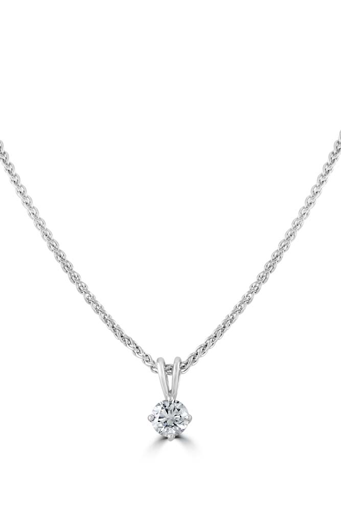 An 18ct white gold pendant featuring a single, dazzling round brilliant-cut diamond meticulously set in a four-claw setting. This exquisite design ensures the diamond is the focal point, allowing it to catch the light beautifully and sparkle with every movement. This gorgeous pendant is suspended from an 18ct white gold Spiga chain. Crafted with precision and care, this pendant is a testament to timeless design and luxury. It's an ideal choice for those seeking a piece of jewellery that combines classic beauty with a touch of contemporary sophistication, perfect for any occasion.
