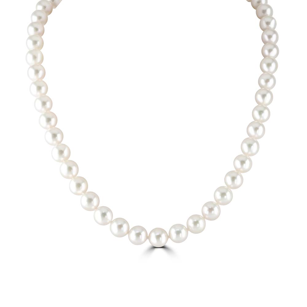 Indulge in the timeless elegance of our strand of 47 AAA-Grade Akoya cultured pearls, each pearl carefully selected to create a seamless flow of beauty and refinement. This exquisite strand features pearls ranging in size from 8.5mm to 9.0mm, showcasing a superior lustre and roundness that exemplify the highest quality in pearl jewellery. Securely fastened with an 18ct white gold ball clasp, this necklace combines both security and style, providing a luxurious finish that complements the pristine white of the pearls. The white gold clasp enhances the sophistication of the strand, making it a perfect choice for both special occasions and everyday luxury. Ideal for elegant affairs, cherished gifts, or personal treasures, this Akoya pearl necklace is a stunning representation of classic sophistication and modern elegance. Embrace the beauty and grandeur of this meticulously crafted piece, a must-have for any connoisseur of fine jewellery.