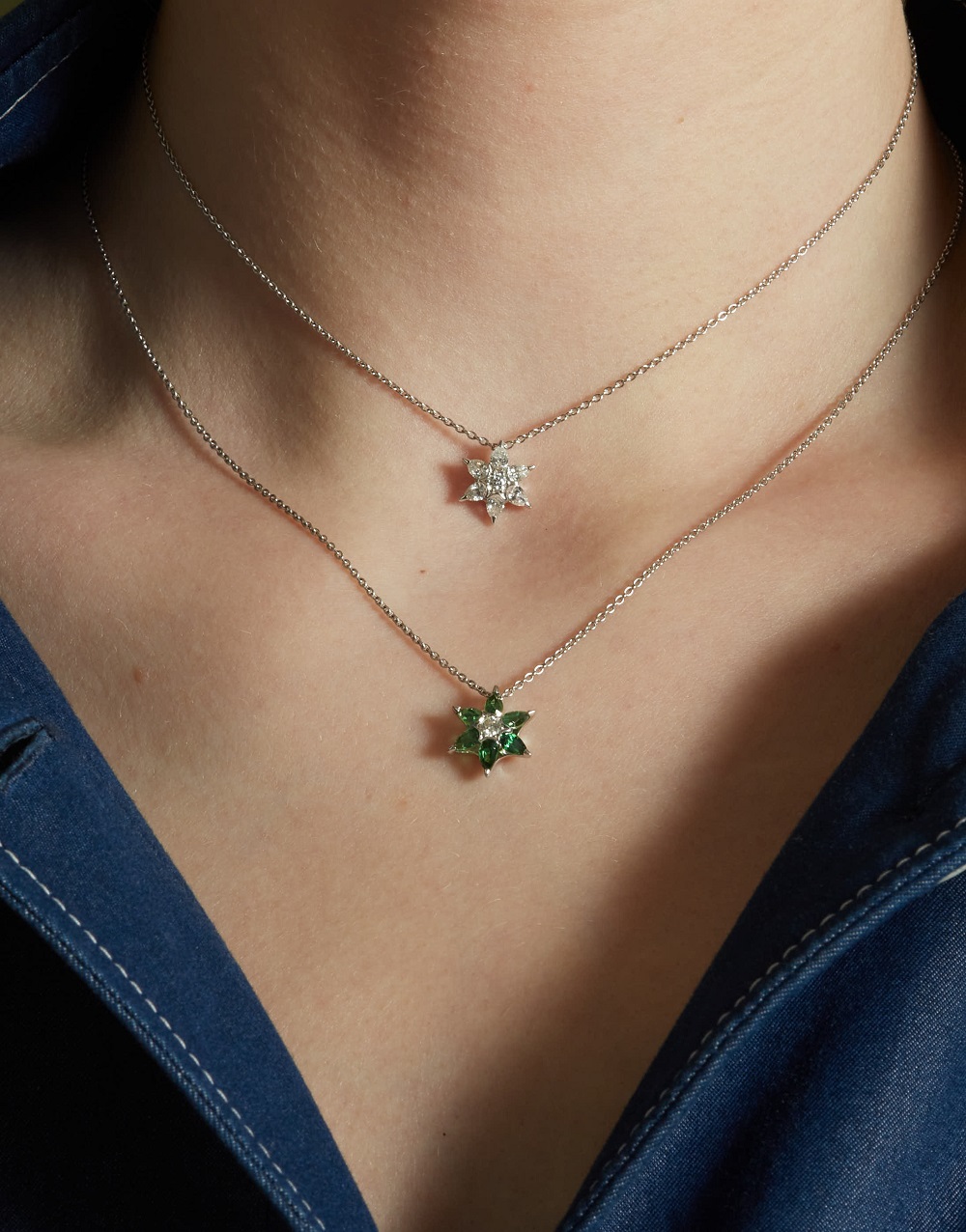 Embrace the enchanting beauty of our 18ct White Gold Flower Shaped Pendant, a stunning piece of jewellery that combines natural inspiration with exquisite craftsmanship. At the centre of this floral-inspired design, a small round brilliant cut diamond is delicately claw-set, weighing 0.08 carats, adding a subtle touch of sparkle. Radiating around this central diamond are six pear-shaped tsavorites, vibrant and lush, with a total weight of 1.04 carats. These vivid green gemstones mimic the petals of a flower, creating a striking contrast against the sleek white gold setting. Suspended from a 17-inch white gold trace chain, this pendant is perfect for adding a splash of colour and sophistication to any outfit. Ideal for those who appreciate the beauty of nature and the artistry of fine jewellery, this piece is sure to become a beloved addition to your collection.